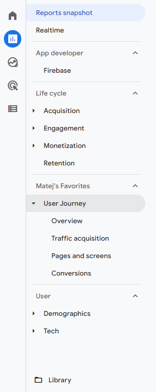 보고서의 세그멘트는 두 그룹으로 분리된 사전 정의된 보고서를 찾을 수 있습니다. 바로 라이프 사이클(Life cycle)과 유저 그룹(User group)입니다. 이는 GA4와 UA 사이와도 비슷합니다. 라이프 사이클은 현재 수익화(Monetization)라고 불리우는 획득(Acquisition)과 전환(Conversions), 참여(Engagement)라고 불리우는 행동(Behavior)과 같은 꽤 친숙한 폴더로 구성됩니다. 이제 잠재 고객(Audience)은 완전히 다른 그룹, 사용자(User)로 지정됩니다.