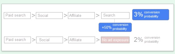 위의 예시에서 처음 세 번째 광고 노출 후 검색에서 네 번째 광고 노출이 3%의 전환 확률로 이어지는 것은 분명합니다. 그 다음 사용자가 4번째 광고 없이 처음 3개의 광고 터치 포인트만 만든 경우 2%의 전환 확률을 갖는 것을 볼 수 있습니다. 계산을 마치기 위해 구글 알고리즘은 검색 광고에 50%의 전환 확률을 적용할 것입니다. 그들은 모든 광고와 인터렉션에 대해 이 과정을 반복하고 있습니다.