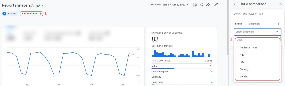 아마도 GA4의 가장 큰 변화는 보고서에서 세그멘트를 비교할 수 있는 방법입니다. 하나는 비교라고 하는 다른 2가지 방법은 UA – 세그멘트에서와 같습니다. 더 쉬운 것부터 시작합니다. 이미 알고 있을 것입니다.
