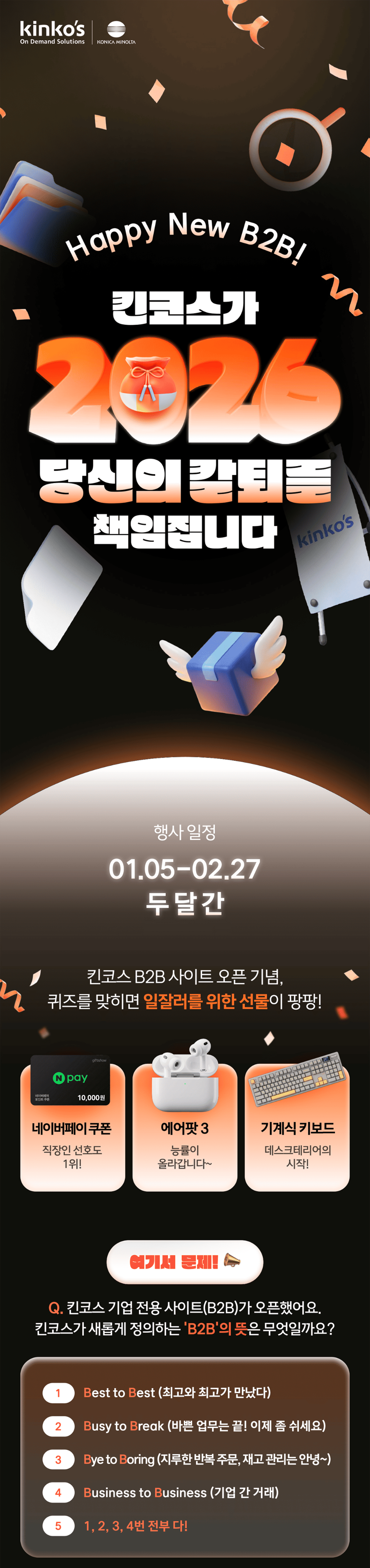 퀴즈풀고 선물받자! 퀴즈만 풀어도 에어팟4, 네이버페이 100% 당첨! 킨코스가 당신의 새해를 응원해요.