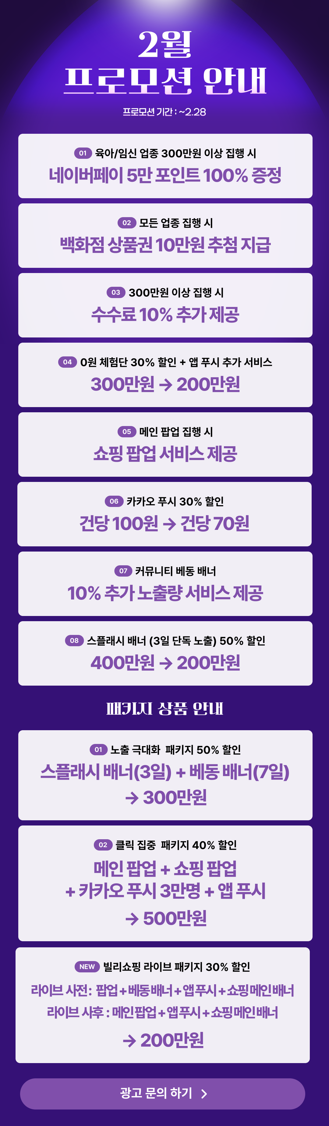 메인 팝업 + 쇼핑 팝업 + 카카오 푸시 3만명 + 앱 푸시빌리 쇼핑 라이브 패키지 200만원 (30% 할인)