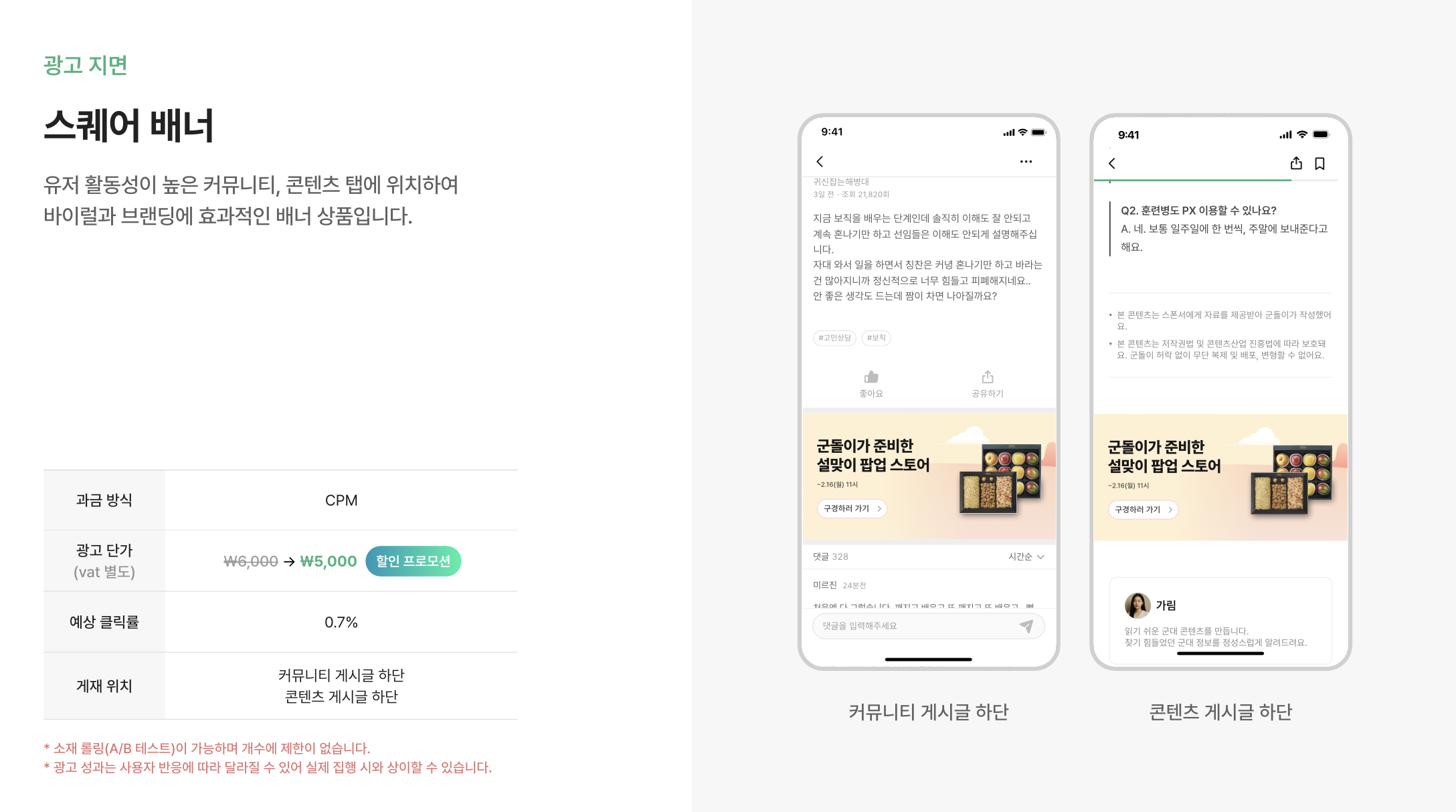 - 유저 활동성이 높은 커뮤니티, 콘텐츠 탭에 노출되는 배너 광고 상품