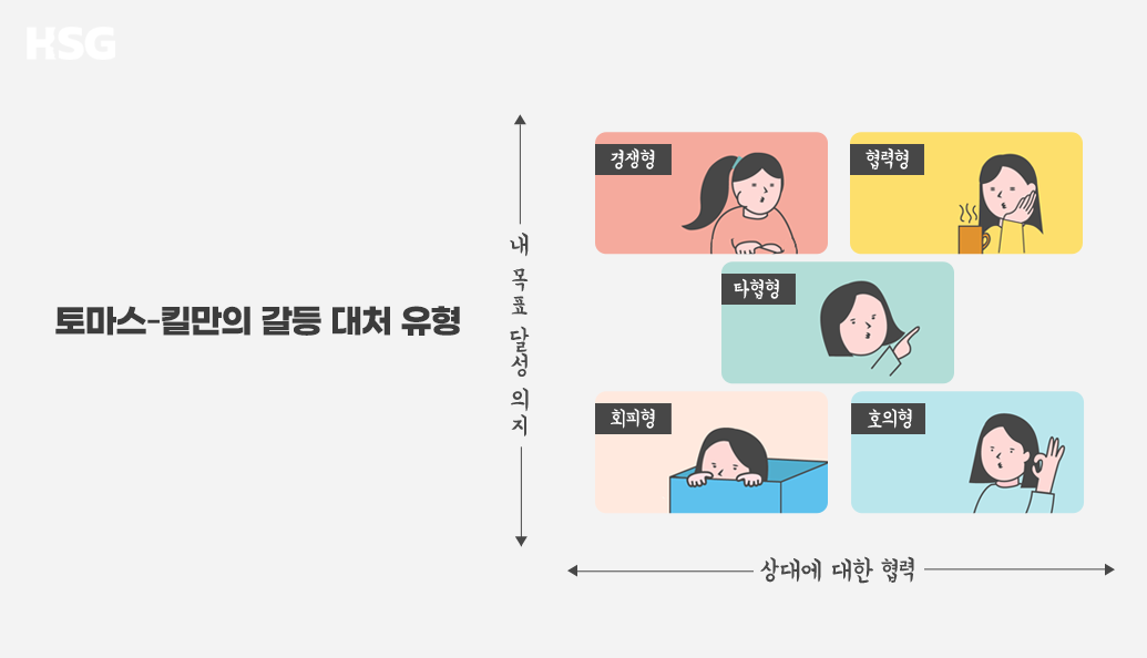 사람의 성향은 다양한 상황에서 무의식적으로 드러납니다. 특히 갈등 상황에서 그 모습이 극명하게 나타나죠. 갈등관리 분야의 대표적인 연구가 토마스(Kenneth W. Thomas)와 킬만(Ralph H. Kilmann)박사는 '상대에 대한 협력 정도'와 '내 목표 달성 의지'라는 2가지 축에 따라 사람들의 갈등 대처 방식을 5가지 유형으로 구분했습니다.