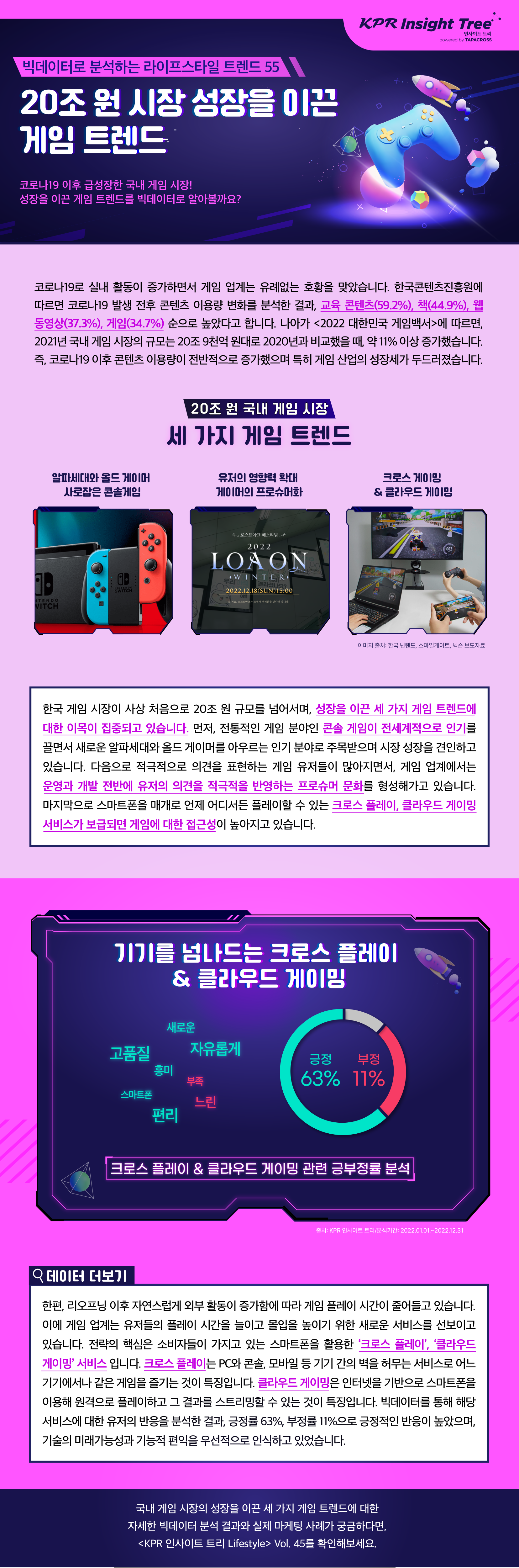 국내 게임 시장의 성장을 견인한 주요 게임 트렌드는 무엇일까요? 이번 비주얼 리포트 55호에서는 빅데이터를 통해 게임 트렌드 세 가지를 자세하게 분석했습니다.