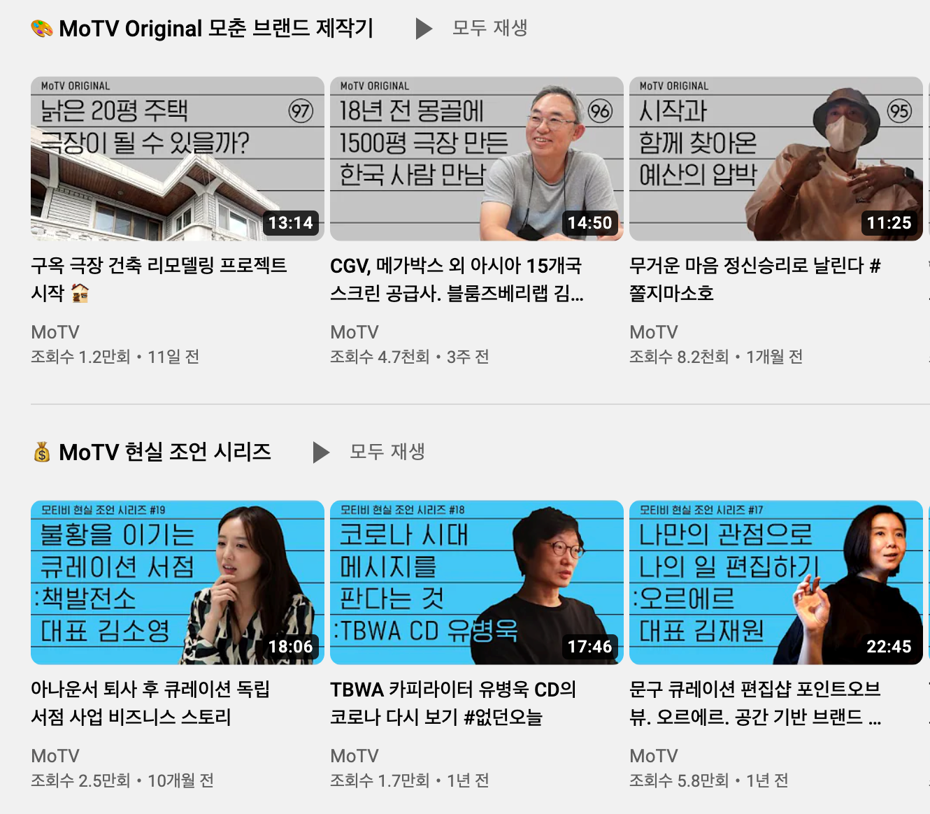 Mo TV는 창업부터 브랜딩까지의 일련의 과정을 콘텐츠로 제작하여 소통하는 채널이다. MO BETTER WORKS, 더 나은 방식으로 일하고 싶은 사람들을 위한 메시지가 담긴 제품을 판매하는 브랜드라는 말처럼 본업은 디자인과 브랜딩이지만 단순한 브랜딩 회사가 아니라 유튜브 채널을 통해 ‘일의 문화'와 관련된 매력적인 브랜드로 포지셔닝하고 있다. 그 과정에서 신한카드나 뉴발란스 같은 큰 기업과도 콜라보를 하기도 하고 유튜브로 그 과정을 담아 <프리워커스>라는 책으로도 출간하기도 하였다.