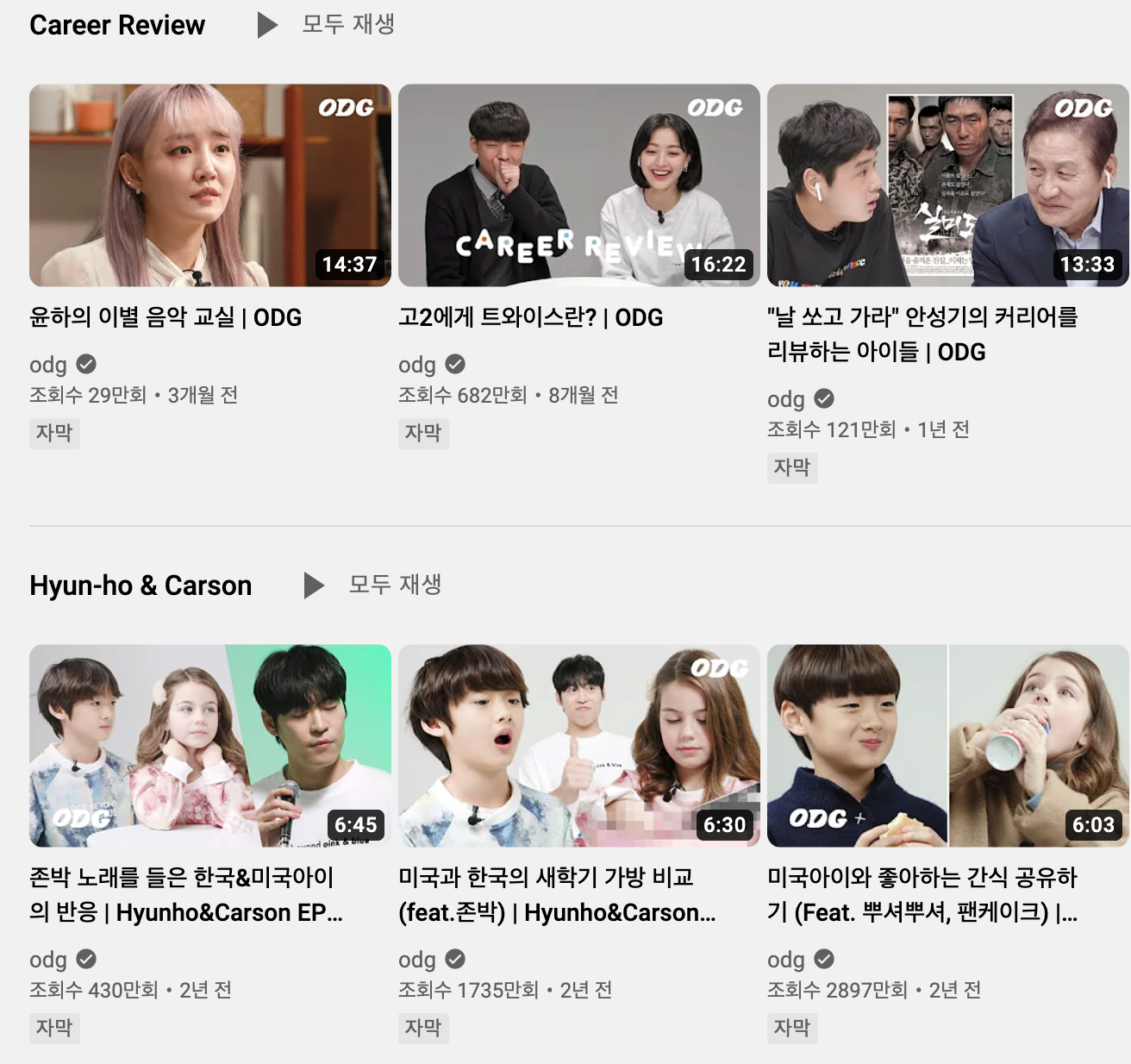이 채널에서는 아이의 시선을 통해 브랜드가 생각하는 세대를 초월하는 철학 메시지를 전달한다. 옷을 대놓고 팔거나 신상을 소개하거나 하지 않는다. 기획 의도와 일관성 있는 콘텐츠가 결합하여 만들어낸 결과다. 그런데 그것이 전부일까? 이 채널은 본업인 비즈니스로도 연결이 된다. 한국 아이와 미국 아이가 등장하여 대화를 나누는 콘텐츠가 6,600만 조회수를 기록했는데 이 아이들이 입고 나온 옷이 모두 ODG의 옷이다. 한개의 영상으로만 6천만이 넘는 사람에게 자연스럽게 본업의 상품을 자연스럽게 소개할 수 있었던 것. 유튜브 채널을 키워 작은 비용으로 최대한의 광고 효과까지 누릴 수 있는 똑똑한 채널인 것이다.