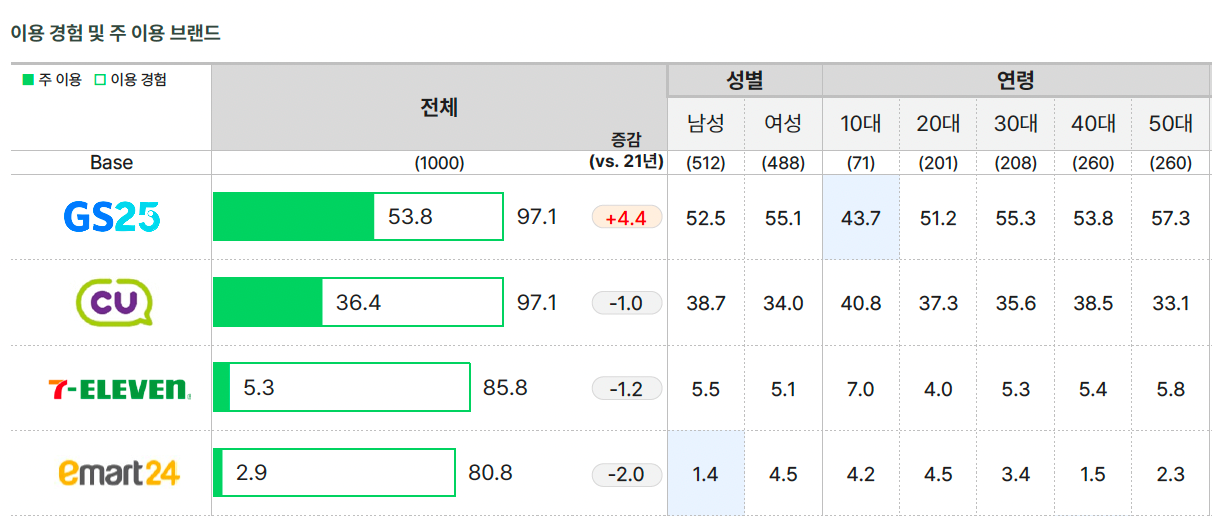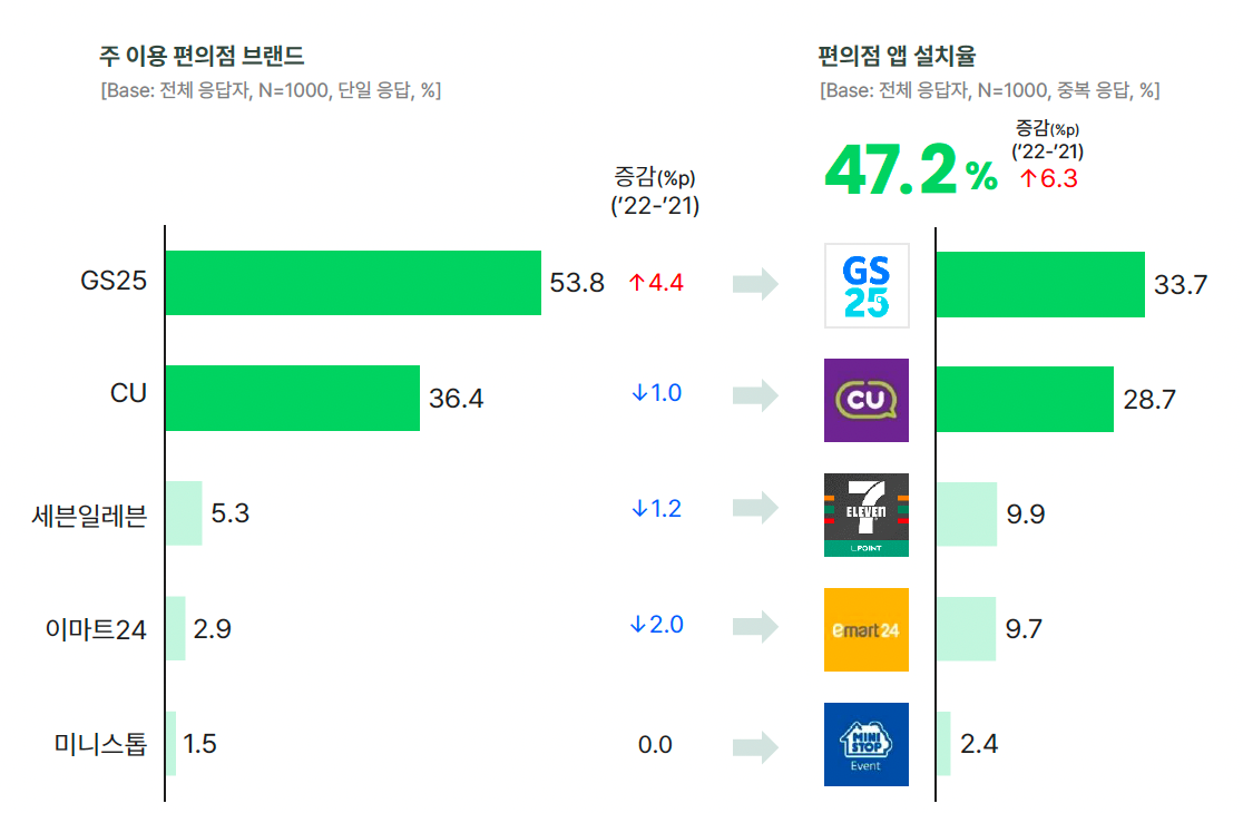 이 채널에서 갓생기획을 소개하고 있는데, MZ세대가 열광하는 신제품을 선보이는 프로젝트로 치킨부터 각종 콜라보 제품까지 이들을 준비하고 출시하는 과정을 선보이며 콘텐츠에서 본업의 비즈니스로 연계하고 있다. 또 평균 4~5개 콘텐츠 중의 하나는 요즘 인기있는 쇼츠나 숏폼 형태로 선보여 좋은 반응을 얻고 있다. 채널을 유지하는데 적지 않은 제작비가 들어갈 텐데 그 결과는 어떨까? 오픈서베이 편의점 조사 결과에 따르면 MZ세대를 포함해 1050 전 세대에 걸쳐 편의점 주이용 및 앱 순위에서 GS25를 1위로 확인해볼 수 있다. 리포트에 보면 GS 편의점을 이용하는 이유 중 하나가 다양하고 긍정적인 이미지를 갖고 있다는 것인데 유튜브 채널이 그 게이트 역할을 하고 있을 것이다.