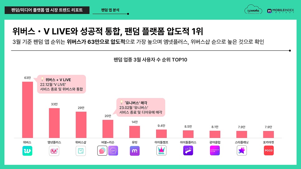 - 위버스 ・ V LIVE와 성공적 통합, 팬덤 플랫폼 압도적 1위