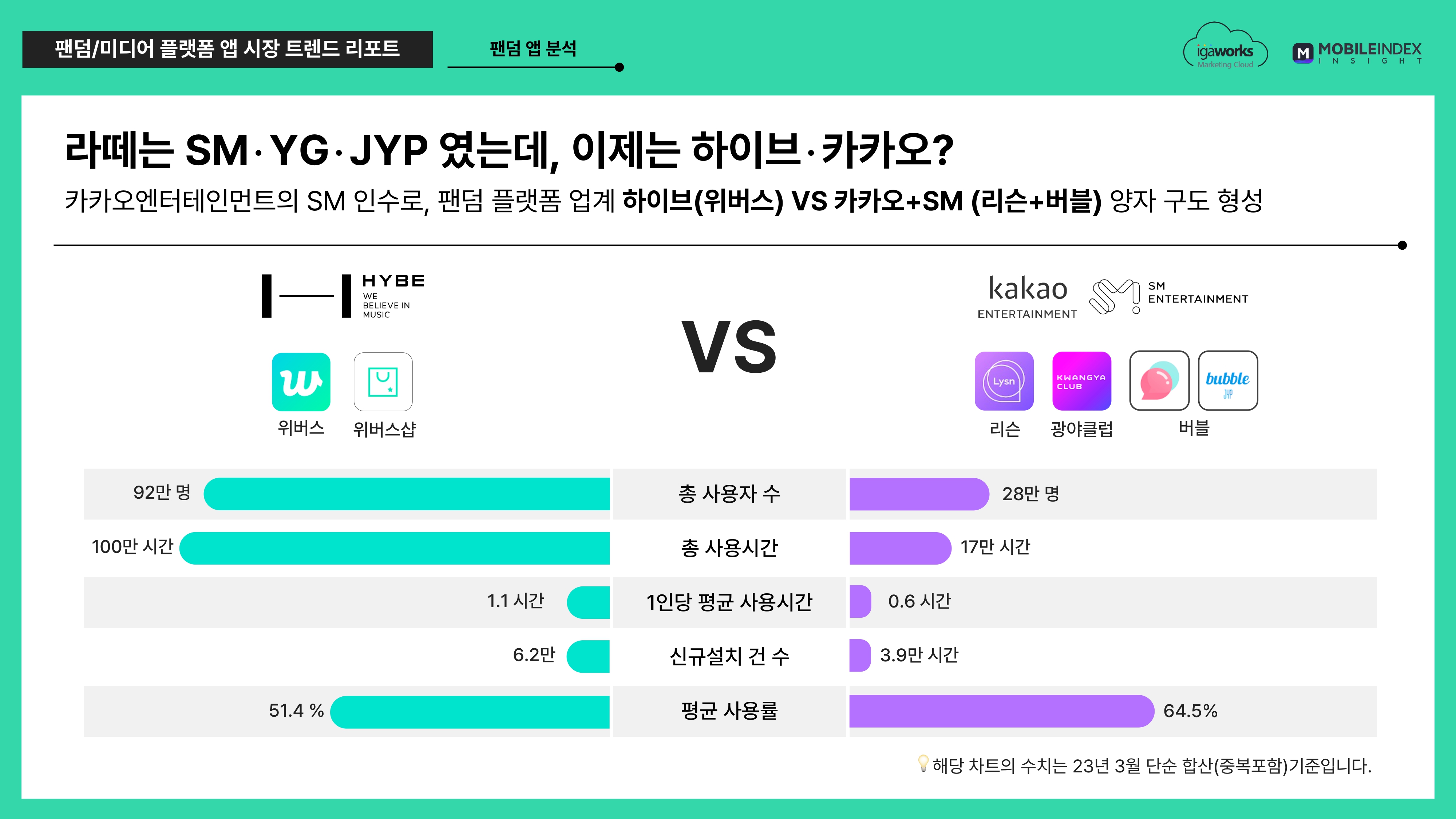 이들의 주요 수치(단순합산 기준)를 확인해보면 총 사용자 수, 사용시간, 1인당 평균 사용시간, 신규설치 건 수 는 위버스가 앞서고 있으나 평균 사용률의 경우 리슨,광야클럽,버블이 앞서고 있는것으로 나타났습니다.