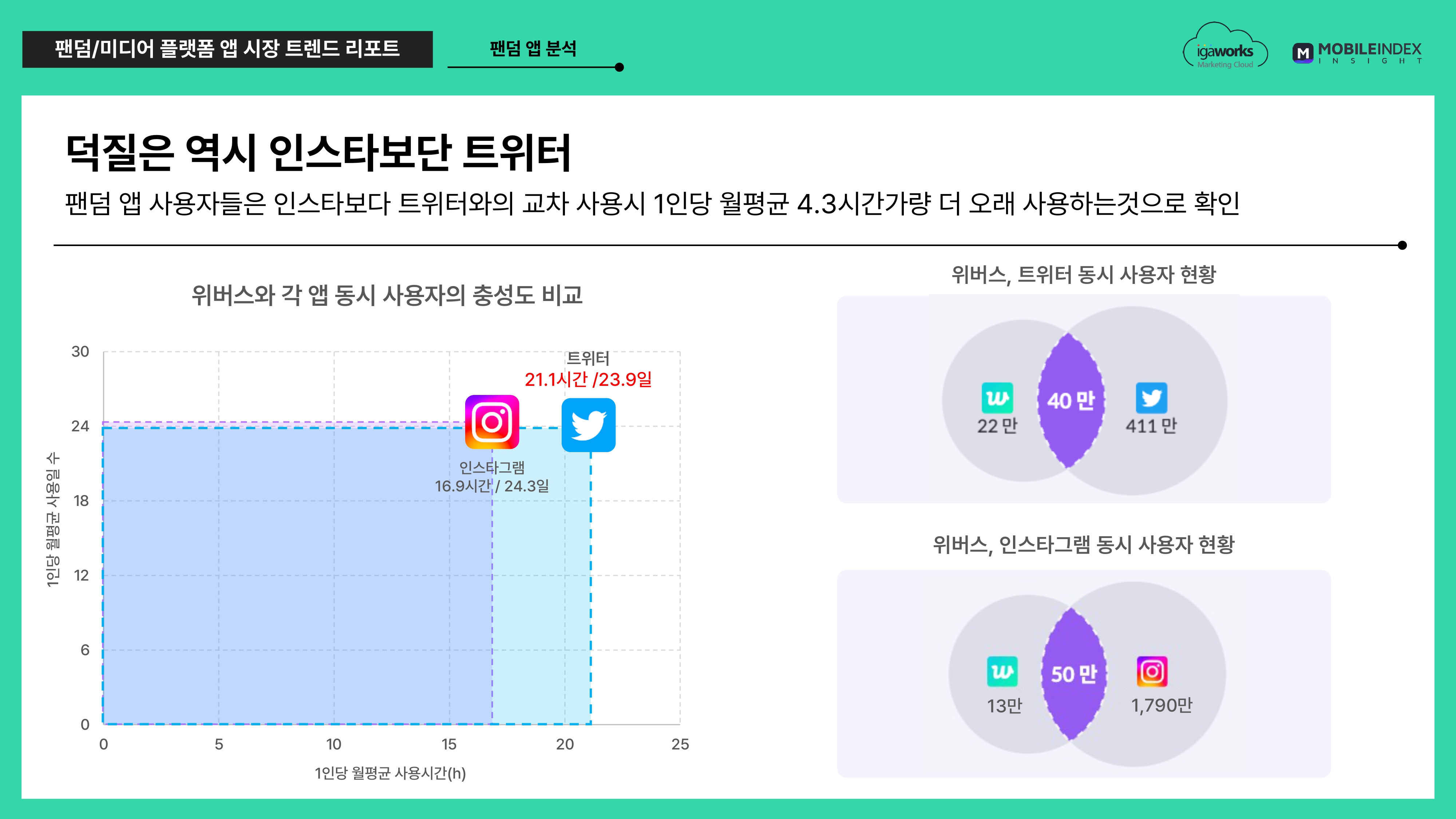 위버스와 인스타, 트위터의 동시 사용자들의 사용 현황을 살펴보니 정말 트위터를 더 오랜 시간 사용하는 것으로 나타났습니다.