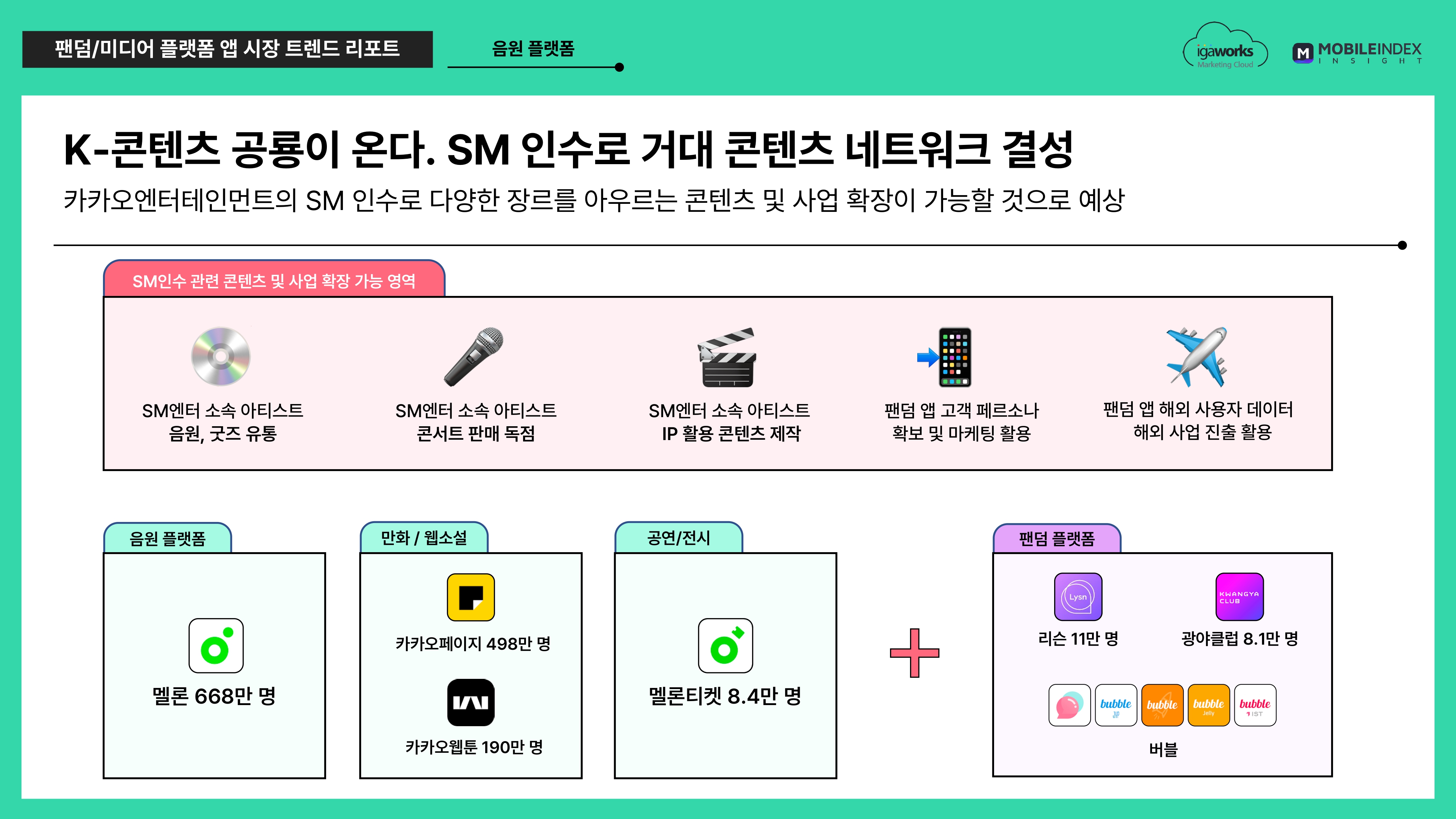 SM엔터테인먼트가 가진 소속 아티스트들의 강력한 팬덤, IP와 카카오엔터테인먼트의 IT기술을 융합하면 음원, 콘텐츠, 콘서트 독점 유통 또는 팬덤 앱 사용자 데이터로 부터 얻은 고객 페르소나 확보 및 이를 마케팅에 활용할 수 있을것으로 예상됩니다.
