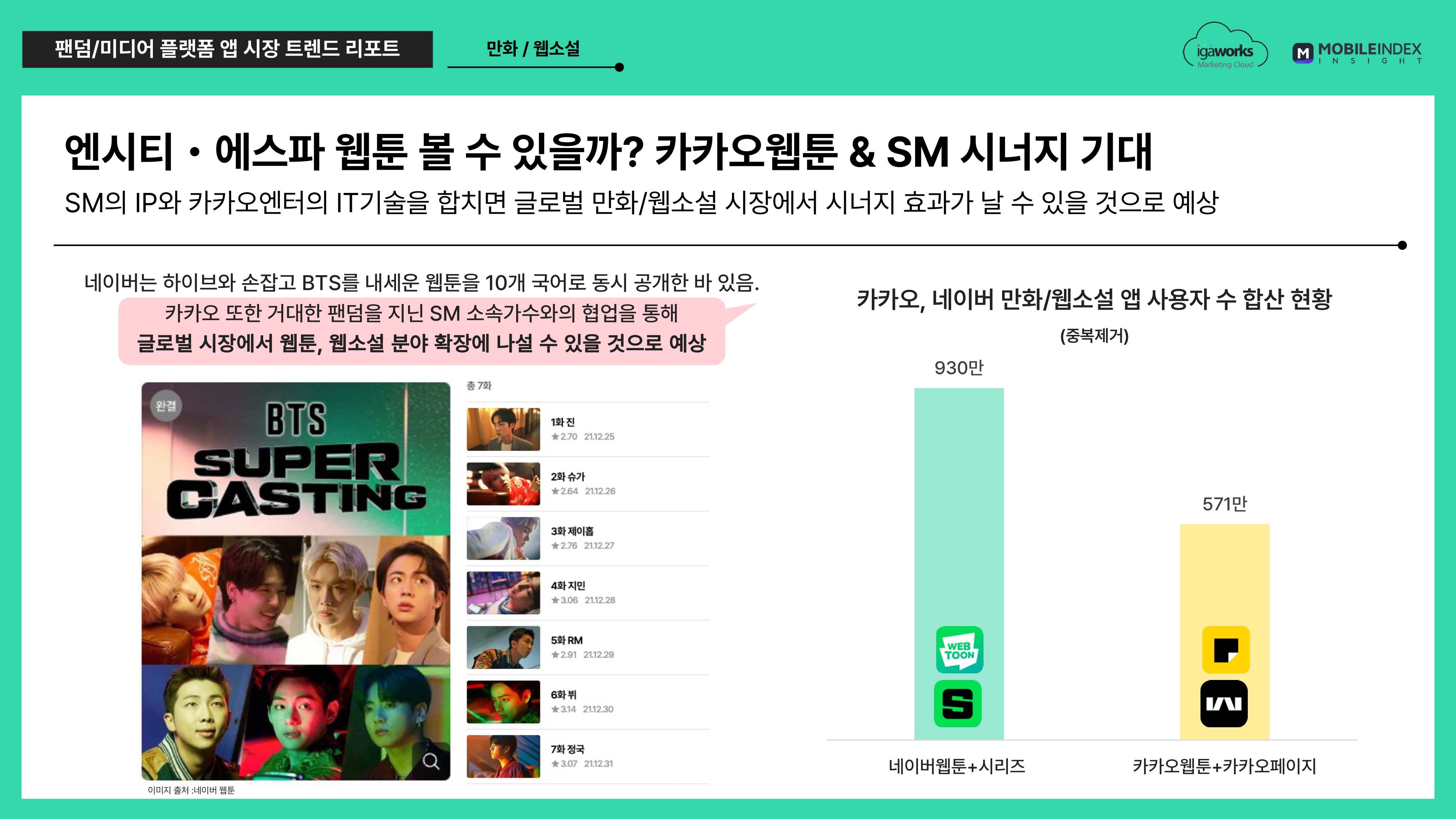 네이버웹툰의 숙명의 라이벌, 카카오웹툰+카카오페이지 역시 거대한 팬덤을 지닌 SM소속가수와의 협업을 통해 글로벌 시장에서의 웹툰, 웹소설 분야 확장에 나설 수 있을 것으로 예상됩니다.