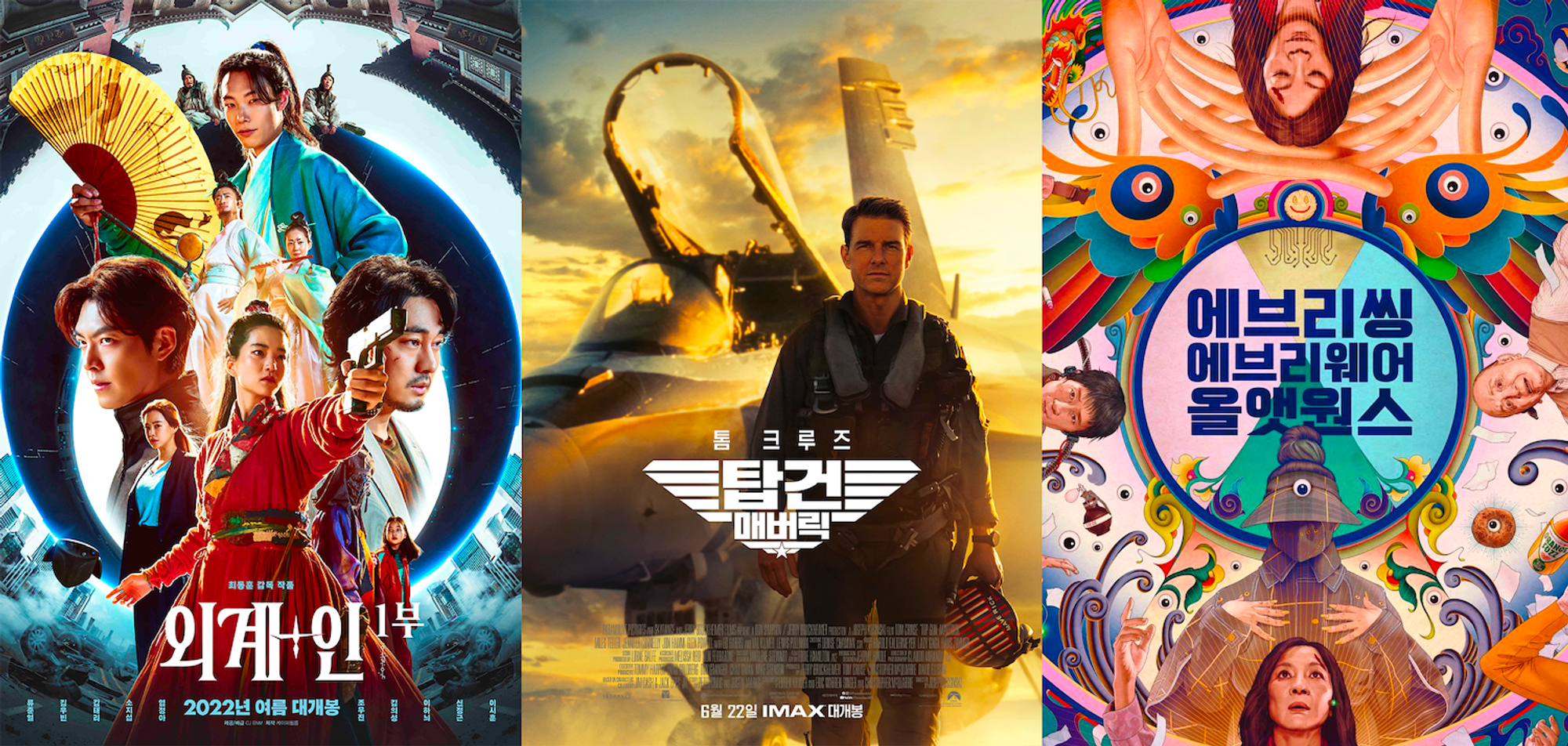 왼쪽부터 <외계+인> 1부 포스터, <탑건: 매버릭> 포스터, <에브리씽 에브리웨어 올앳원스> 포스터