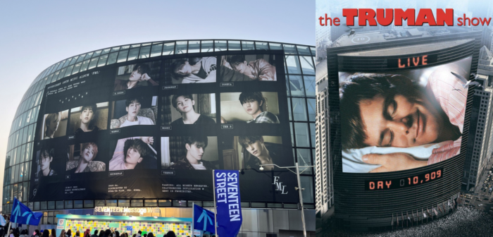 그리고 온라인으로 공개되는 티징 이미지를 오프라인에서 바로 만나볼 수 있도록 3일간 대형 현수막을 설치하고 변경했는데요. 트루먼쇼가 전 세계로 방영되고 있음을 보여주는 영화 포스터를 오마주한 것이 아니냐며 팬들 사이에서 팝업을 재방문하게 되는 계기가 되기도 했어요. (실제 인공섬인 ‘세빛섬’과 인공섬으로 만들어진 곳에 살던 트루먼의 세계관을 오프라인 팝업 장소로 기획했다는 점도 팬들이 추리해 낸 포인트✨)