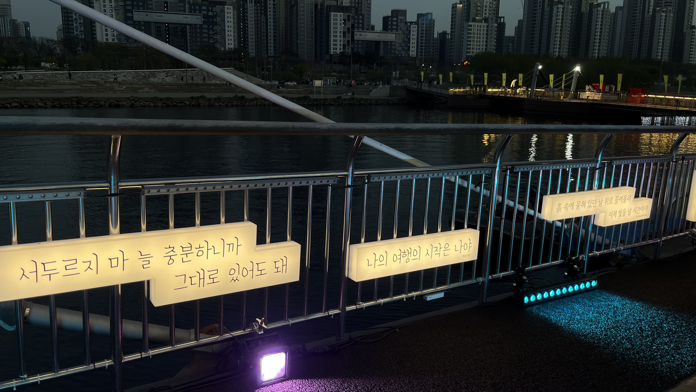 이 밖에도 섬과 섬을 이동하는 다리에 세븐틴 노래 가사를 전광판으로 장식해 낮과 밤 각기 다른 풍경을 감상할 수 있는 포인트를 제공하거나, 강에 슈퍼 캐럿봉(응원봉) 포토존을 구성해 ‘실외’라는 공간적 특성을 적극 활용한 점도 좋았어요. 팝업을 관람하며 세븐틴 음악을 들을 수 있도록 플레이리스트가 담긴 QR코드를 X배너로 곳곳에 배치해 찐팬이라면 좀 더 몰입감 있는 관람을, 세븐틴이 처음이라면 자연스럽게 음악까지 들어볼 수 있도록 구성한 것도 좋은 포인트였고요.