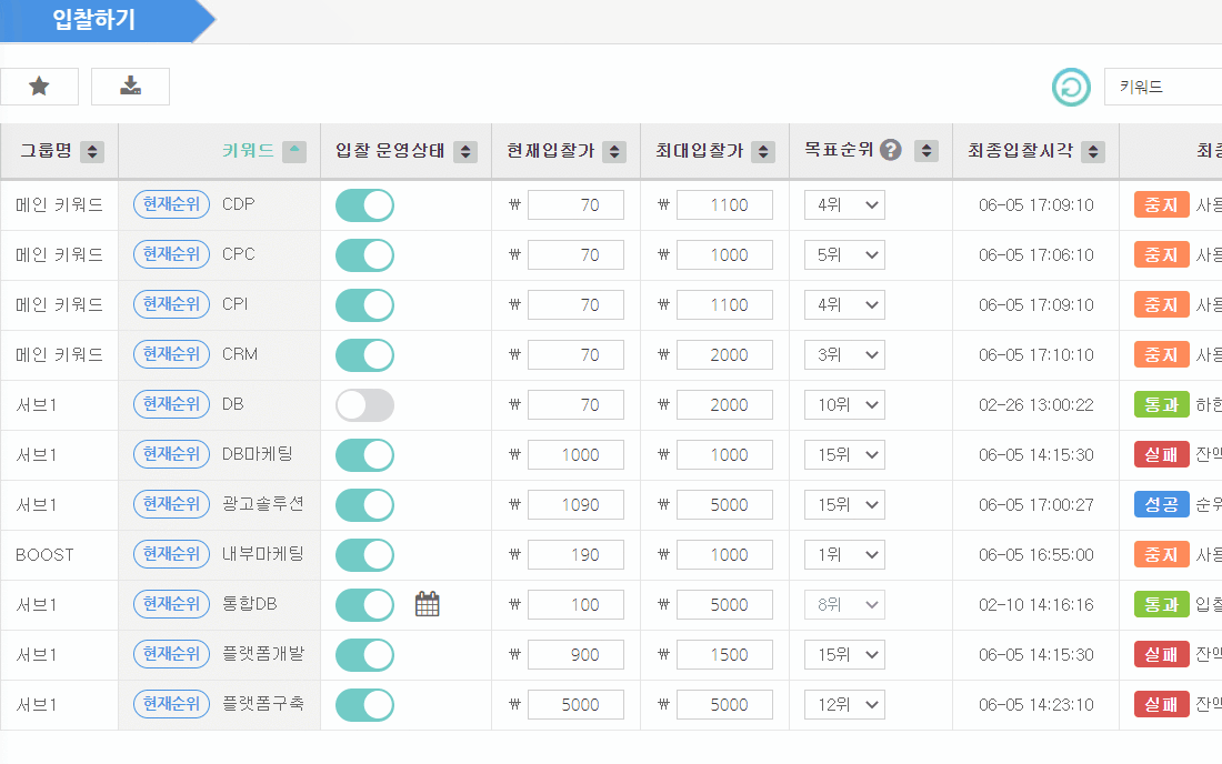 광고대행사의 노하우를 모두 갖춘 키워드 자동입찰 시스템으로 트렌드에 맞춰 성과중심의 입찰 전략을 도출하여 효율적인 광고를 운영할 수 있도록 도와드립니다.