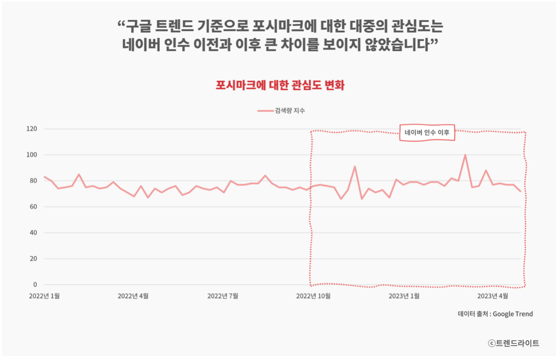 포시마크를 향한 관심도가 네이버 인수 이후 특별히 변화한 것으론 보이진 않습니다
