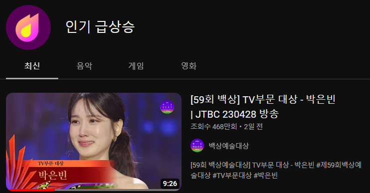 대상을 받은 박은빈 배우의 수상소감은 백상예술대상 이후 꾸준히 유튜브 인기 급상승 동영상에서 자리를 지키고 있으며, 단 3일 만에 조회수 450만 회를 넘겼죠.
