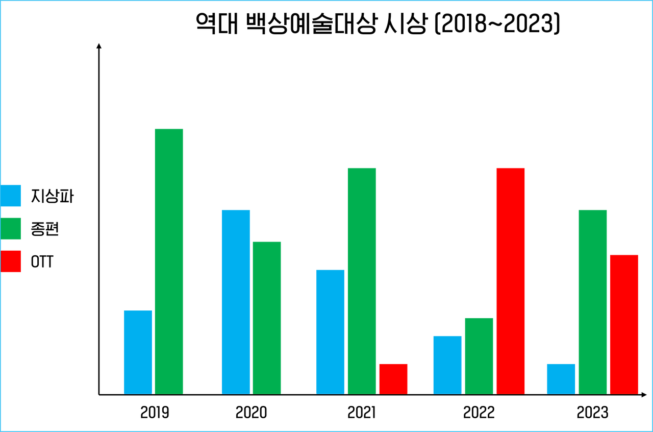 근데, 가장 두드러진 점은 OTT의 엄청난 행보입니다. OTT의 경우 2020년 '킹덤 2'를 통해서 처음으로 백상예술대상에 모습을 드러냈습니다. 이후 2년 뒤인 2022년부터는 전체 시상의 50%를 차지할 정도(총 26개 중 13개 시상)로 엄청난 행보를 보여줬어요.