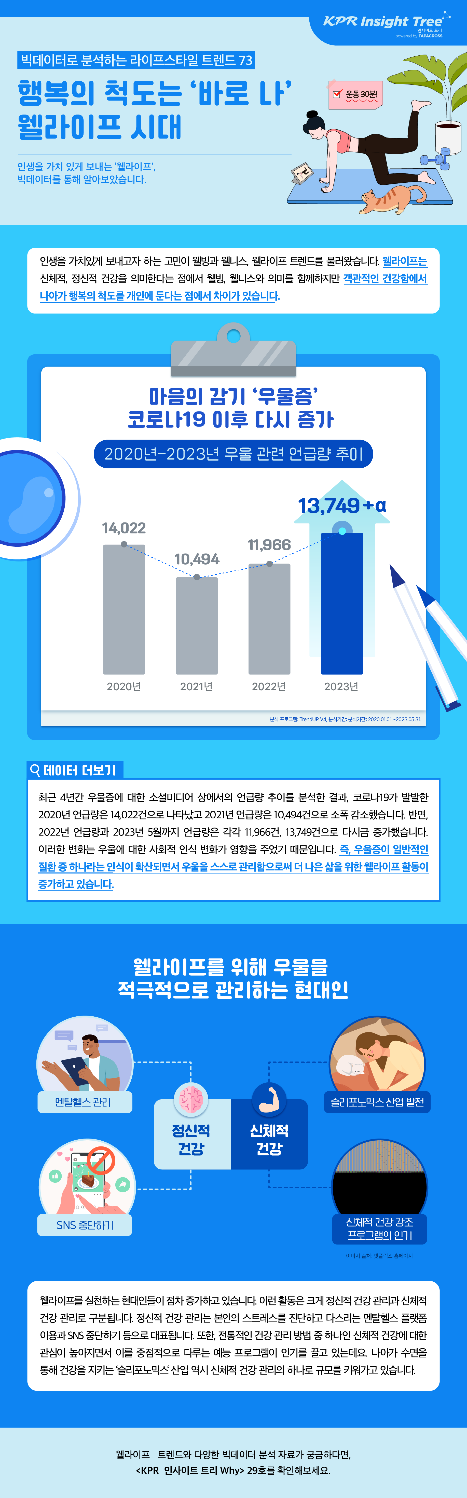 이번 비주얼리포트에서는 웰라이프의 발달 배경으로 여겨지는 현대인의 우울을 빅데이터로 자세히 분석해보았고, 나를 위해 삶을 건강하게 가꾸는 웰라이프 사례를 함께 제시했습니다.