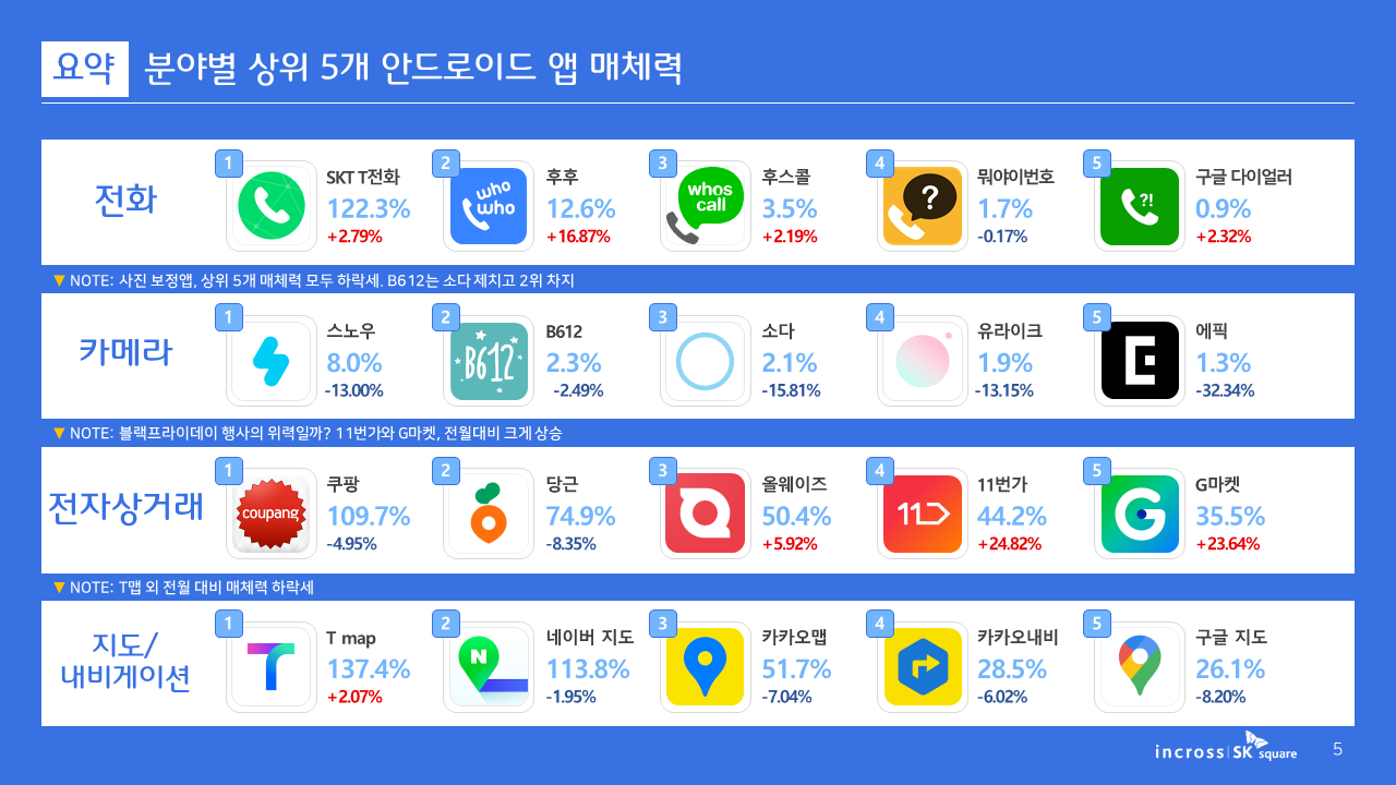 🪄 카메라: 사진 보정앱, 상위 5개 매체력 모두 하락세. B612는 소다 제치고 2위 차지