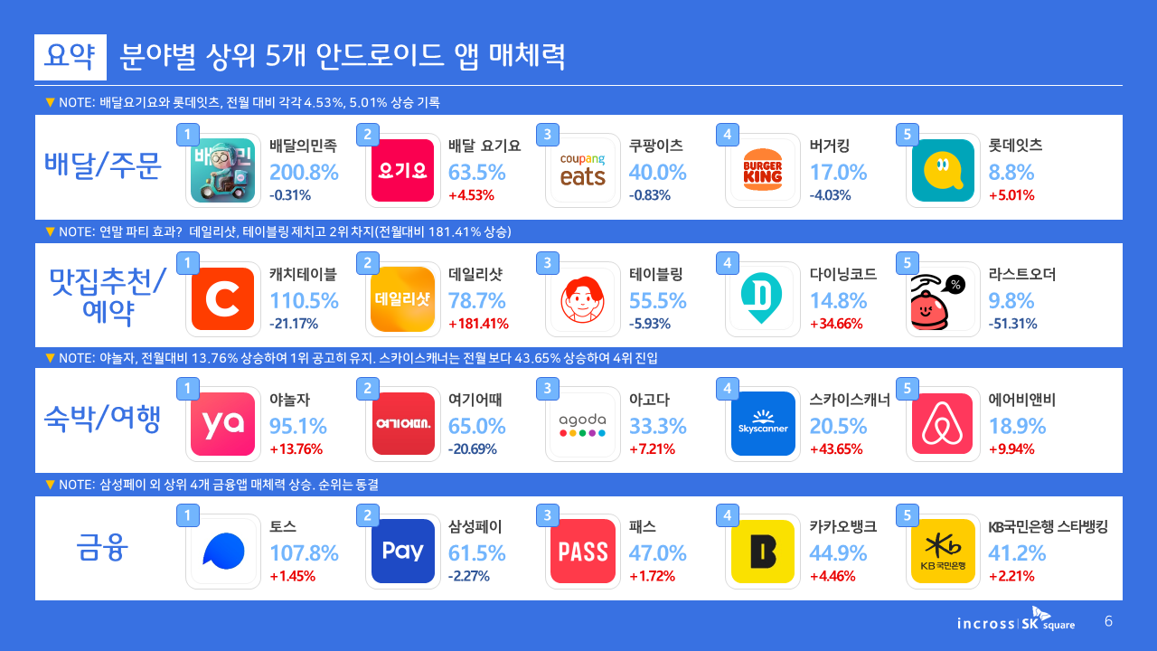 🪄 숙박/여행: 야놀자, 전월대비 13.76% 상승하여 1위 공고히 유지. 스카이스캐너는 전월 보다 43.65% 상승하여 4위 진입