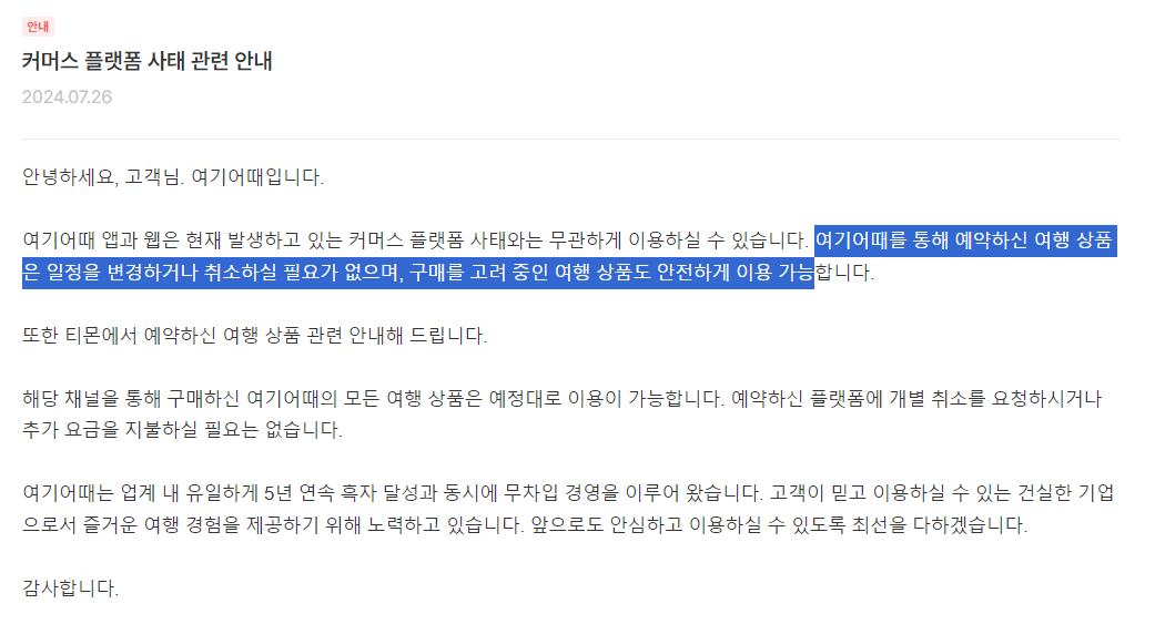 고객 못지않게 타격을 받은 곳들은 여행/숙박 기업들인데요. 티메프로부터 정산을 받지 못한 데다가 고객들의 환불에도 응대를 해야 했기에 골치가 아팠습니다. 모두가 대응에 대해 고민하고 있을 무렵 '여기어때'는 가장 먼저 "책임경영 차원에서 예약한 모든 숙박을 정상 진행하기로 했다"라고 밝히며 고객들로부터 긍정적인 평가를 받았습니다.