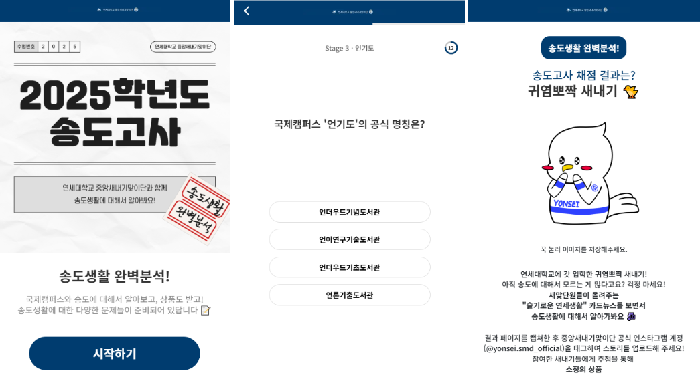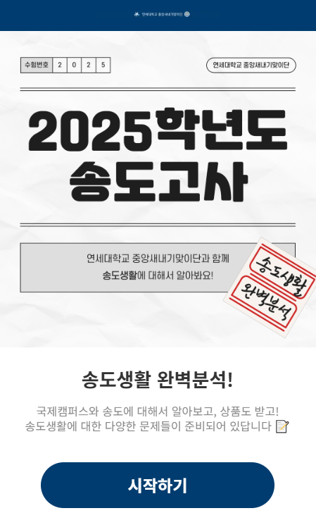 최병준: <새맞단과 함께하는 송도고사>는 연세대학교 국제캠퍼스 생활을 주제로 한 모의고사 형식의 퀴즈에요! 기숙사인 송도학사, 트리플스트리트, 언더우드 기념도서관, 강의동 등 주요 생활 공간을 중심으로 15문항을 구성했어요. 신입생들이 자연스럽게 송도 생활을 익히고 친숙함을 느낄 수 있도록 기획했습니다.