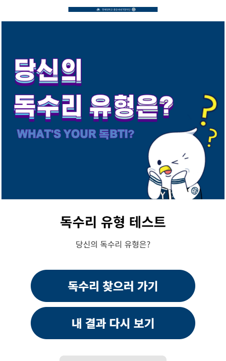 변은형: <당신의 독수리 유형은?>은 MBTI 유형 검사를 연세대학교의 상징인 독수리와 결합한 콘텐츠예요. 독수리의 앞 글자를 따서 ‘독BTI 검사’라는 애칭으로도 불리고 있어요!(웃음) ‘독BTI’ 검사는 신입생들이 자신의 독수리 유형을 알아보며 학교생활에 대한 기대감을 가질 수 있도록 기획했어요. 실제 대학 생활에서 경험할 수 있는 다양한 상황을 바탕으로 질문을 구성했고, 결과 화면에서는 재학생들이 자주 입는 과잠과 후리스를 입은 독수리 캐릭터를 활용해 친근함을 더했습니다.