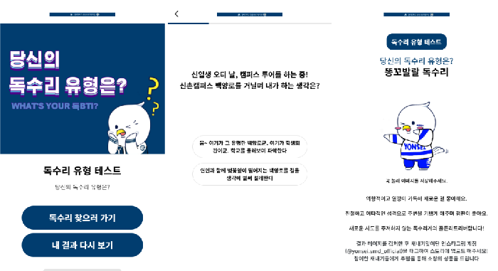 두 콘텐츠 모두 학교의 특색이 잘 드러나도록 연세대학교 마스코트인 연수리를 참고해서 결과 페이지에 필요한 이미지를 모두 직접 만들었어요.