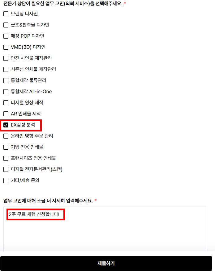 문의 유형에서 'EX감성 분석' 솔루션을 선택 하시면 2주 무료 프로그램 체험 등록에 대한 안내를 드려요.