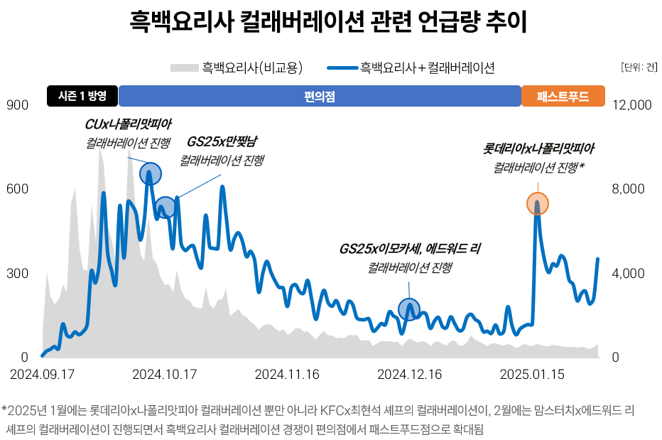 <흑백요리사>는 지난해 10월에 종영되었는데, 지금까지도 컬래버레이션 제품들이 나오고 있다는 점이 흥미로운데요. 프로그램 종영 이후로도 화제성이 계속해서 이어지고 있는 걸까요? 대학내일20대연구소의 <트렌드 리포트 : Social Listening (2025년 2월호)>를 통해 ‘흑백요리사 컬래버레이션’ 언급량 추이를 확인해 보았습니다.