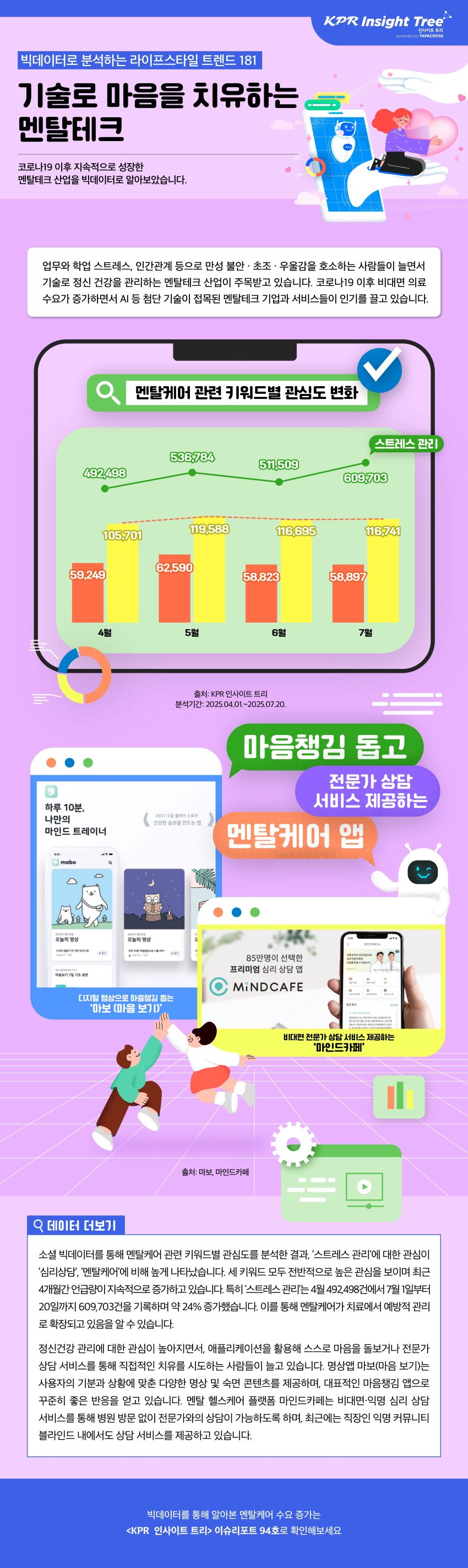 업무와 학업 스트레스, 인간관계 등으로 만성 불안∙초조∙우울감을 호소하는 사람들이 늘면서 기술로 정신 건강을 관리하는 멘탈테크 산업이 주목받고 있습니다. 코로나19 이후 비대면 의료 수요가 증가하면서 AI 등 첨단 기술이 접목된 멘탈테크 기업과 서비스들이 인기를 끌고 있습니다.