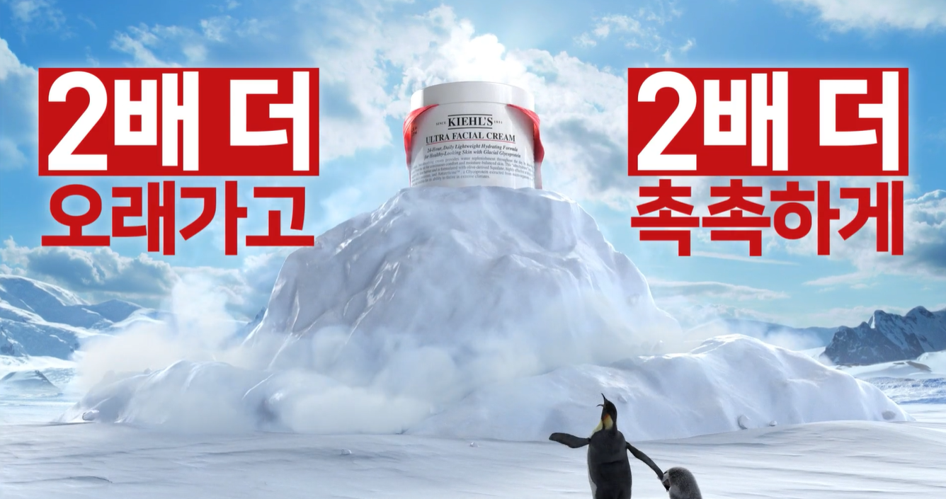 키엘 울트라 훼이셜 크림 광고 영상은 키엘의 울트라 훼이셜 크림의 리뉴얼을 맞아 제작된 해당 영상은 리뉴얼을 하면서 제품이 정확히 어떤 부분이 업그레이드 되었는 지를 영상 내 카피를 통해 강조하고 있습니다. 여름을 맞아 제품의 시원함과 수분감이 부각되도록 펭귄, 빙하, 물 등을 활용해서 연출되었습니다.