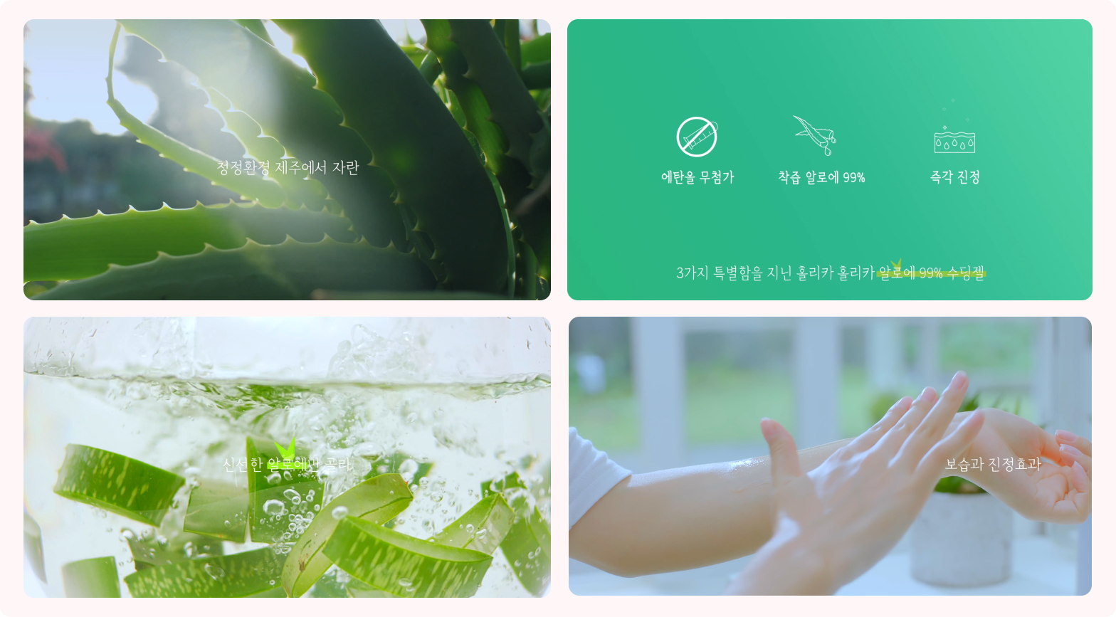 홀리카 홀리카의 알로에 수딩젤 홍보 캠페인 영상 역시 제품의 USP를 쉽게 인지할 수 있도록 제작되었는데요. 청정한 제주에서 자란 알로에를 원료로 만들어진 수딩젤이라는 것을 영상을 통해 확실하게 알 수 있습니다. 실사 촬영을 통해 제주 환경, 알로에 등을 촬영하면서 인포그래픽 요소로 ‘에탄올 무첨가’, ‘즉각 진정’ 등의 정보를 전달함으로써 제품을 사용하면 특정 효과를 기대할 수 있다는 것을 알 수 있습니다.