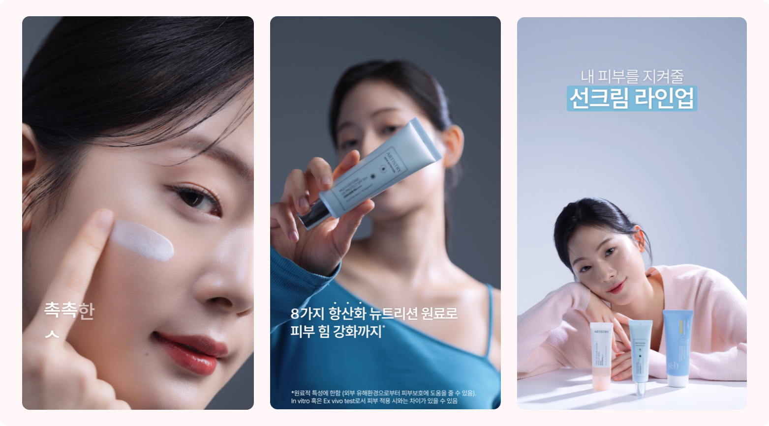 아티스트리 뉴트리션 선크림 시리즈 제품 숏폼 영상은 숏폼에서 많이 활용하는 제형을 표현하는 컷과 사용 연출을 포함하면서 후반부는 브랜드 인지 요소까지 포함하여 제작되었습니다. 이렇게 숏폼 영상을 제작하더라도 파트별로 분배를 해서 제작하면 영상을 잘라서 다양하게 활용할 수 있다는 장점이 있어요.