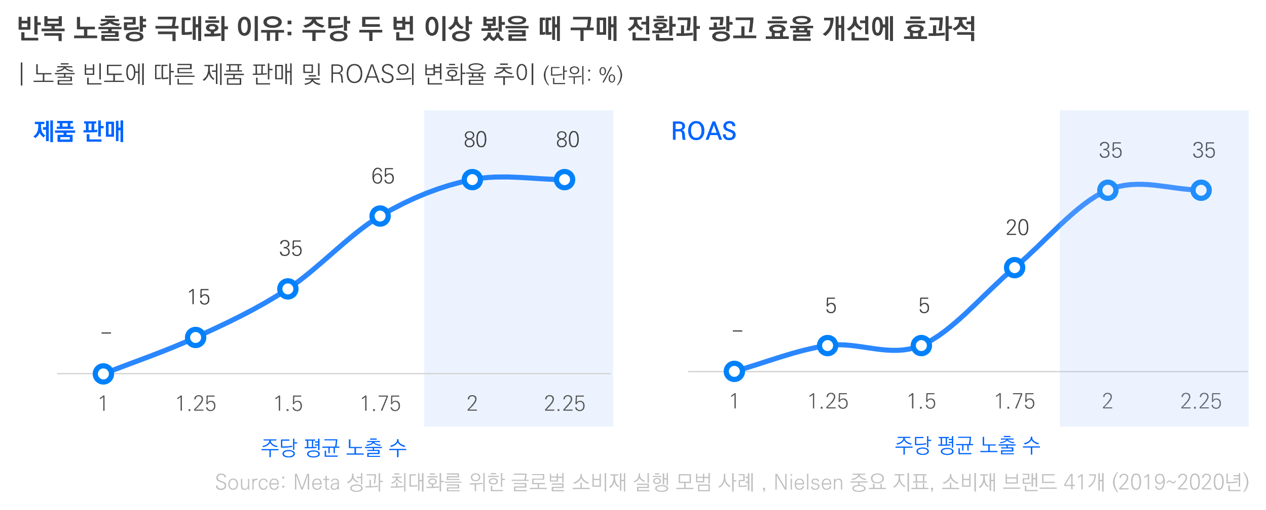 또, 추천 콘텐츠를 빠르게 스크롤해 보는 환경이 조성되어 있는 SNS에서 눈에 띄기 위해서는 반복 노출이 중요해요. 소비재 브랜드 퍼포먼스 성과 분석 결과, 평균 노출 횟수가 2회 이상인 시점부터 제품 판매 변화율은 80%로, ROAS 변화율도 35%에 도달했어요. 이처럼 반복 노출을 통해 소비자 구매 의향을 극대화할 수 있어요.