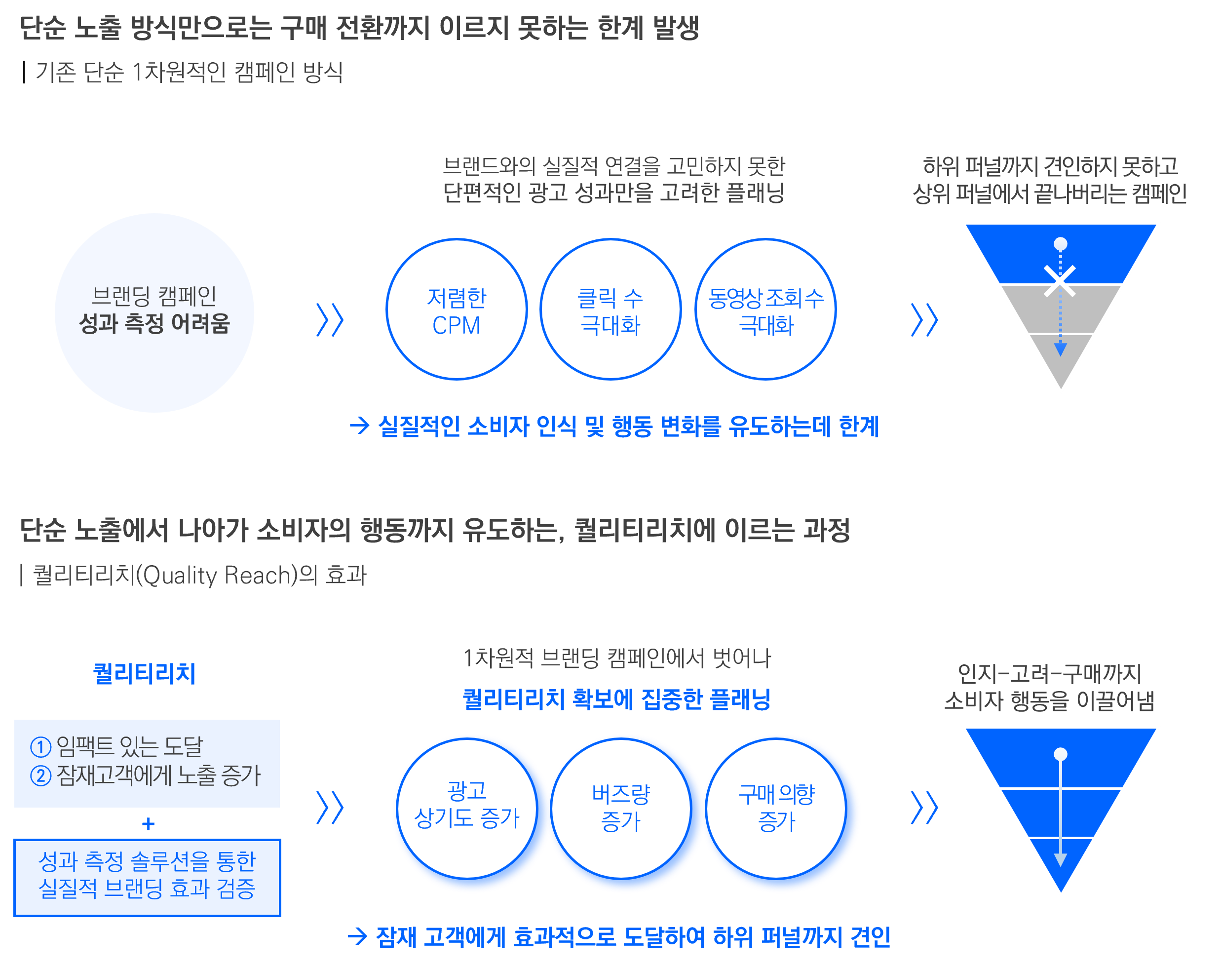 기존의 CPM, 클릭 수 등 1차원적인 광고 지표 확보에 초점을 둔 플래닝에서 벗어나 퀄리티리치에 집중할 때 광고 상기도 증가, 버즈량 증가, 구매 의향 증가 등의 효과를 이끌고 소비자 행동까지 변화시킬 수 있어요.