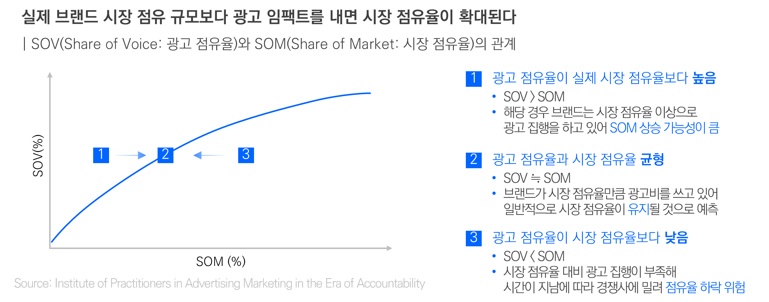 광고 시장에서 브랜드 시장 점유 수준보다 광고 점유율을 높이면, 시장 점유율이 확대된다는 연구 결과가 있어요. 광고점유율 극대화로 더 많은 잠재고객을 발굴해 임팩트를 줄 수 있고, 이를 통해 전환까지 증대할 수 있어요.