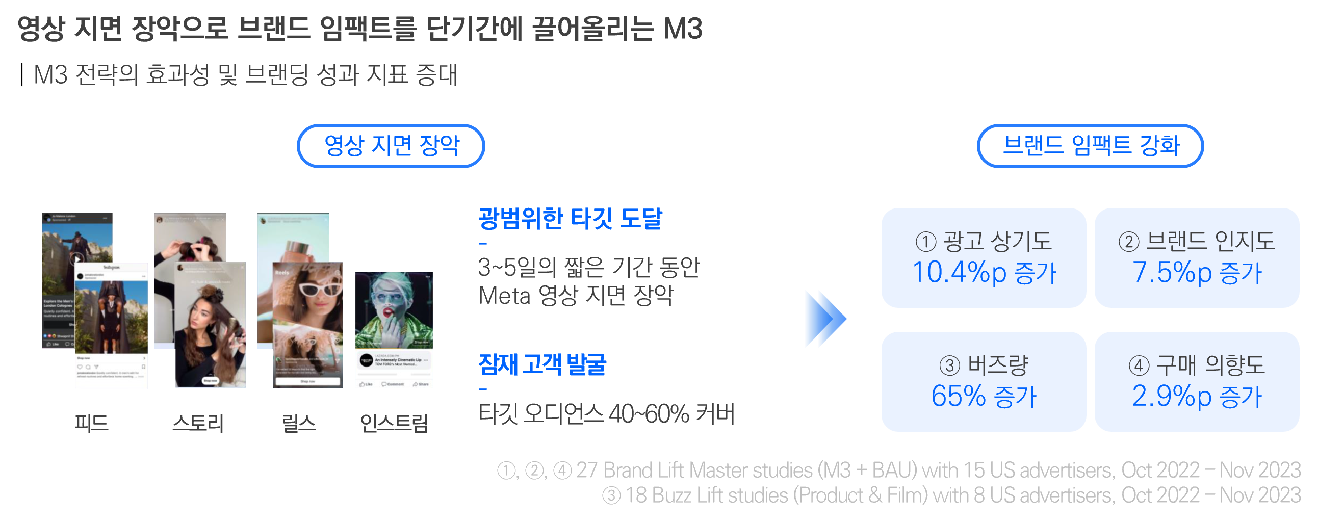 메타에서는 신제품 출시, 시즈널 이슈 등 브랜드에게 중요한 순간, 3-5일 단기간 내 타깃 오디언스의 40~60%를 커버하여 임팩트를 끌어올리는 전략을 제시해요. 이를 Meta Moment Maker(M3) 전략이라고 해요. Meta Moment Maker(M3)는 메타 플랫폼 내 단기간 동안 영상 지면을 장악해 브랜드 각인과 상기도 증대에 효과적이에요.