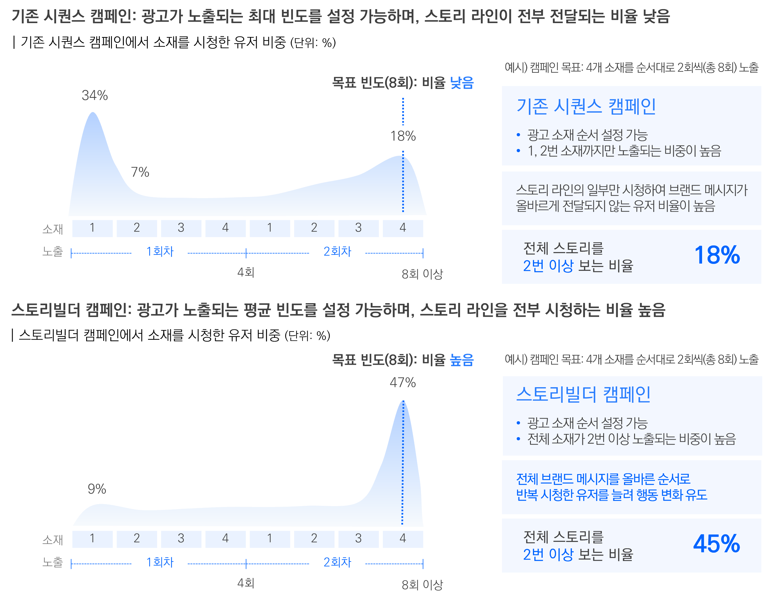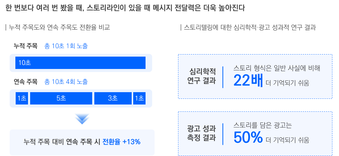 광고 집행 시, 누적해서 10초 동안 한 번 보는 경우에 비해 짧더라도 여러 번 짧게 끊어서 총 10초를 보는 경우가 전환율 증대에 효과적이라는 연구 결과가 있어요. 즉, 같은 시간을 시청한다면 노출 빈도가 높은 편이 더 유리하다는 점을 알 수 있어요. 여기에 ‘스토리가 있는 경우’ 일반 사실에 비해 기억되기 더욱 쉽다는 심리학·광고 성과 연구 결과까지 더해서, 스토리가 있는 광고의 노출 빈도를 높이는 것으로 광고 효과를 극대화할 수 있어요.