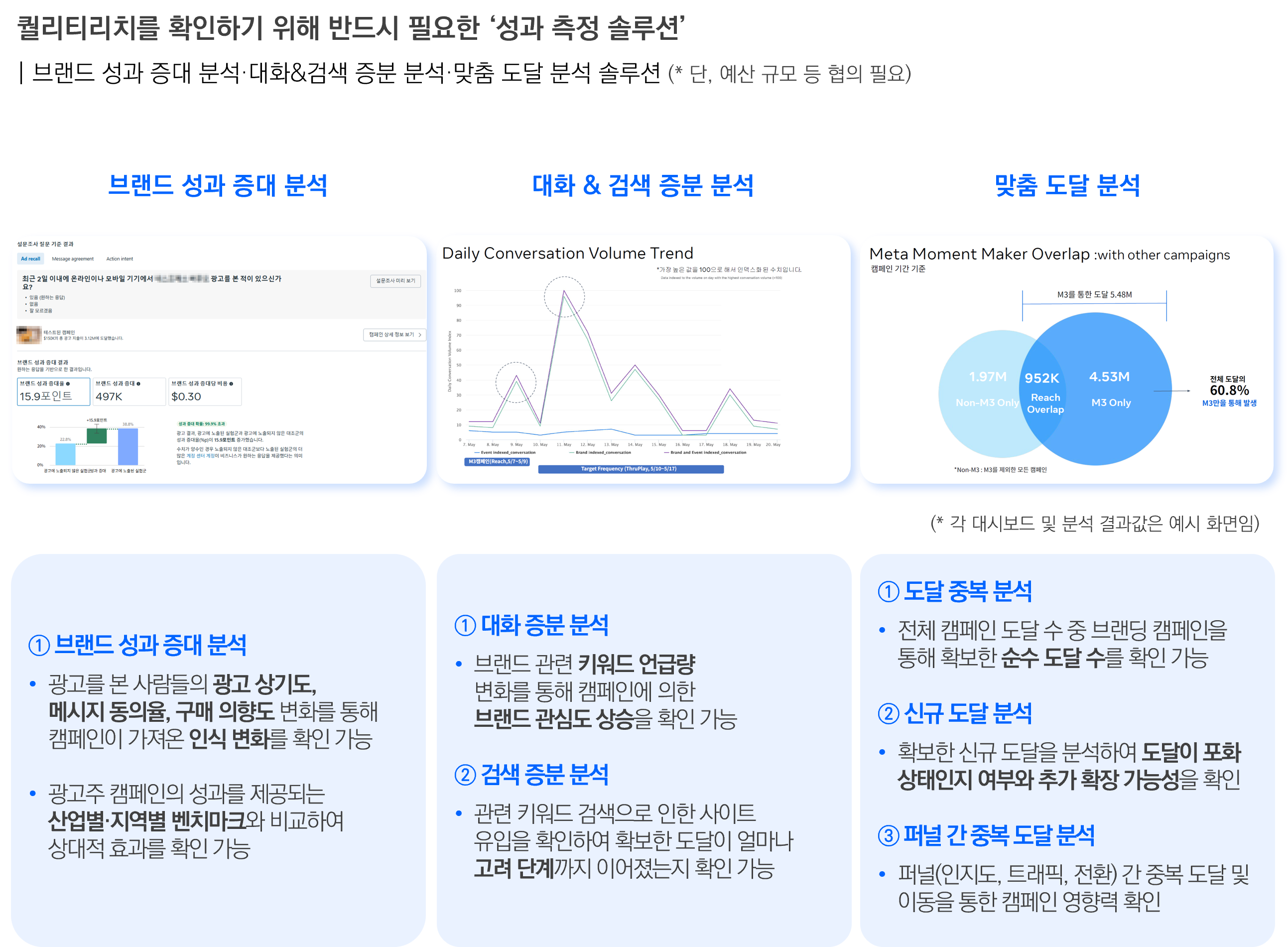 앞선 M3, 스토리빌더를 포함한 브랜딩 캠페인 집행 이후 메타는 브랜딩 캠페인의 성과를 측정할 수 있는 솔루션을 제공하고 있어요. ➀브랜드 성과 증대 분석, ➁ 대화&검색 증분 분석, ➂ 맞춤 도달 분석 등 다양한 솔루션을 제공해 브랜딩 캠페인이 유저의 인식과 행동 변화에 얼마나 영향을 미쳤는지 가시적으로 검증할 수 있어요. (*예산 규모 등에 따른 협의 필요)