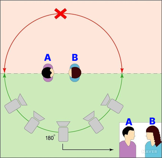 180도 법칙은 두 사람이 마주 보거나 대화하는 모습을 촬영할 때 가상선을 설정하고 그 선을 넘지 않게 한 쪽 면에서만 촬영하는 것을 말합니다. 동일한 장면 안에선 배우들의 좌우 위치가 언제나 같아야 한다는 규칙인데요! 그림의 경우 카메라는 180도 선을 기준으로 녹색의 공간 안에서 두 인물을 찍어야 합니다. A 캐릭터를 찍을 때는 B 캐릭터 왼쪽에, B 캐릭터를 찍을 때는 A 캐릭터 오른쪽에 위치해 촬영해야 해요.