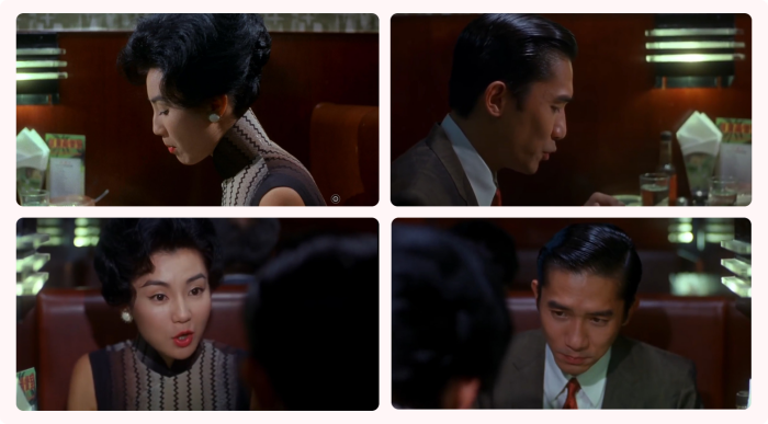 하지만 모든 상황에서 180도 법칙이 지켜지는 것은 아닌데요. 인물의 심리 상태와 감정 변화를 나타내기 위해 의도적으로 법칙을 깰 때도 있습니다. 영화 ‘화양연화’에선 인물 간 대화의 톤이 바뀔 때 법칙을 깨고 위치를 바꿔 감정과 이성 사이에서 고민하고 있는 두 인물의 혼란스럽고 복잡한 마음을 표현한 것입니다.