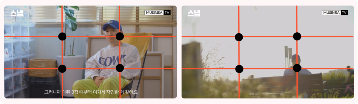 힙합 최강 듀오! 다이나믹 듀오 개코 데일리 패션 공개 ㅣ 패션 셀럽 인터뷰 [스냅] 영상에선 화면을 3등분으로 나눴을 때 선이 지나가는 교차점 위치에 인물을 두고 촬영한 것을 알 수 있습니다. 이렇게 배치했을 때 피사체를 중앙에 두는 것보다 깊이감 전달이 더 가능해져요! 사람들은 오히려 화면 중앙보다 약간 벗어난 주변을 자연스럽게 인식하기 때문에 피사체를 교차점에 두면 안정적으로 시선 유도를 할 수 있는 장점이 있습니다.