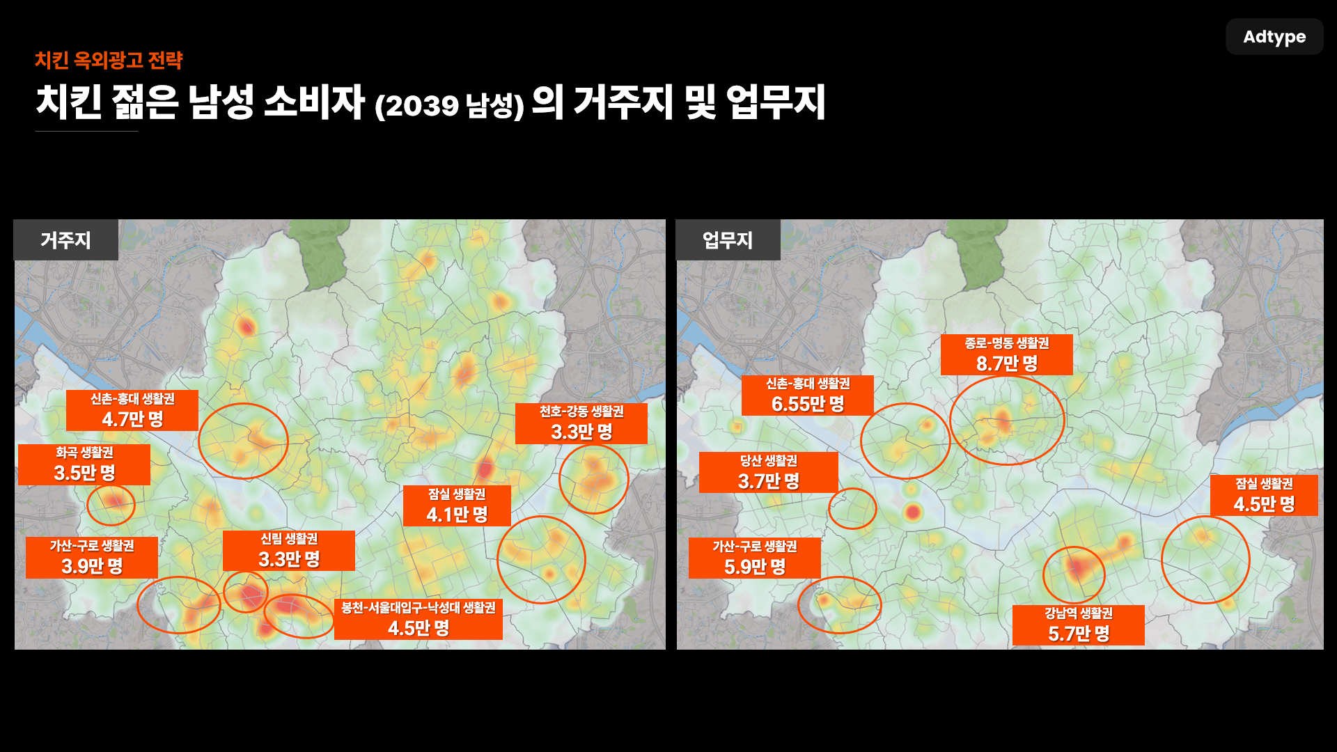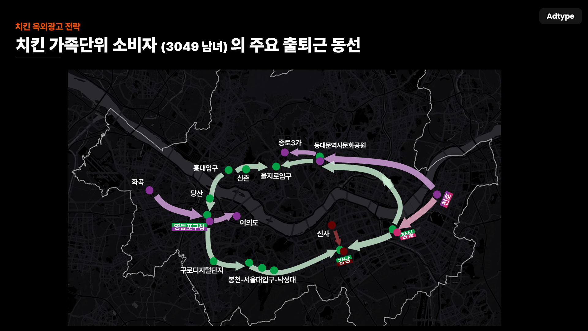- 애드타입에서는 데이터 기반 F&B 옥외광고 전략을 제안합니다. 치킨은 저녁·주말, 가족·2039 남성이 주요 소비층으로서 출퇴근 동선 상에 있는 매체, 그리고 아파트 매체를 활용하여 노출하는 전략이 효과적입니다.
