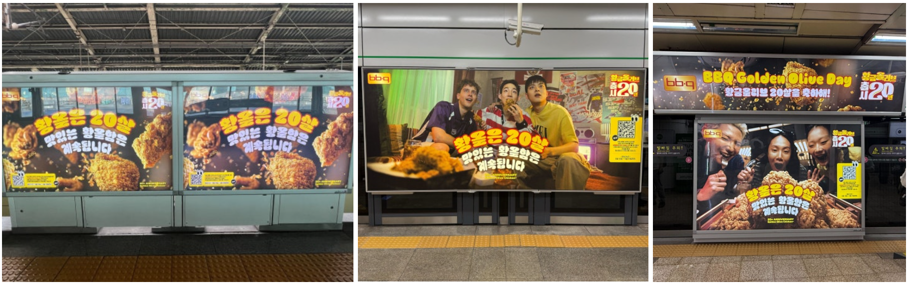 두 번째 사례(가운데)는 2호선 신촌역 스크린도어에 설치한 사례로서, 젊은 남성들이 TV를 보며 치킨을 즐기는 이미지의 소재를 활용하였습니다. 세 번째 사례(오른쪽)은 2호선 홍대입구 스크린도어에 설치한 사례로, 친구들이 함께 치킨을 즐기는 이미지의 소재를 활용하였습니다.