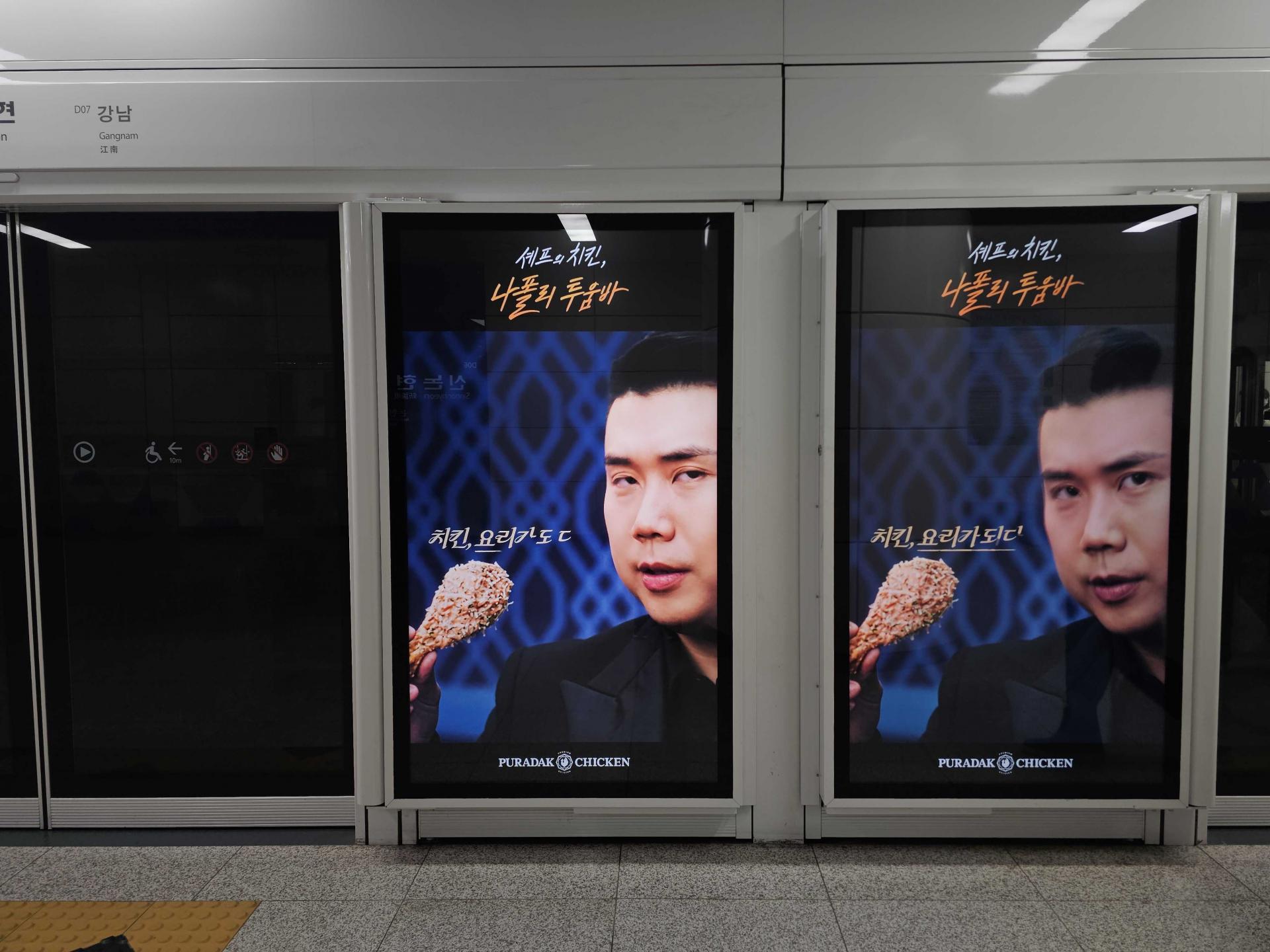 푸라닭은 '나폴리맛피아'로 유명한 권성준 셰프를 모델로, '나폴리 투움바'라는 신메뉴를 옥외광고로 홍보하였습니다. 아래는 신분당선 신논현역 스크린도어를 활용한 사례로, 영상 형태의 광고로 효과적인 노출이 가능했습니다.