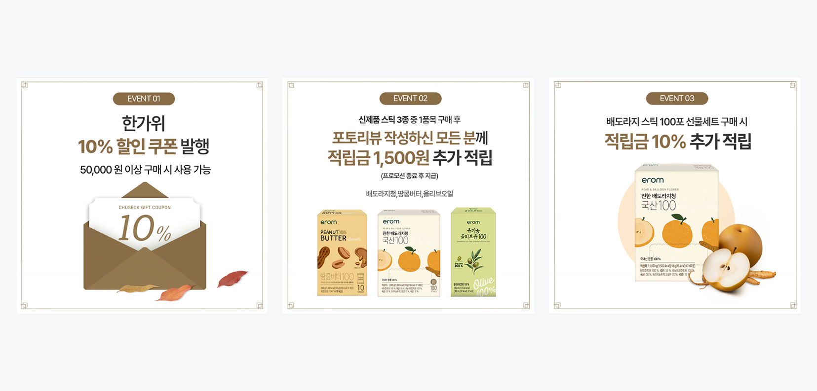 한가위 대명절, 추석이 다가옵니다. 올 추석은 특히 7일이라는 연휴 기간으로 긴데요. 오늘은 자사몰 운영자분들이 추석 시즌마다 어떤 이벤트를 만들어야 할지 고민을 덜어드리기 위해 자사몰 이벤트 레퍼런스를 갖고 왔어요. 아래 예시들을 보고 자사몰 프로모션을 잘 준비하시길 바랄게요.