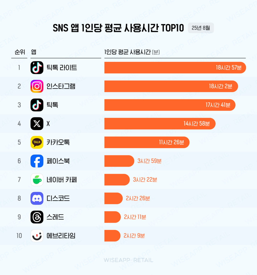 1인당 평균 사용시간이 가장 길었던 SNS 앱은 '틱톡 라이트'로, 18시간 57분을 사용한 것으로 나타났어요. 그 뒤를 이어 인스타그램 18시간 2분, 틱톡 17시간 41분, X 14시간 58분, 카카오톡 11시간 26분, 페이스북 3시간 59분, 네이버 카페 3시간 22분, 디스코드 2시간 26분, 스레드 2시간 11분, 에브리타임 2시간 9분 순으로 오래 사용하고 있어요.
